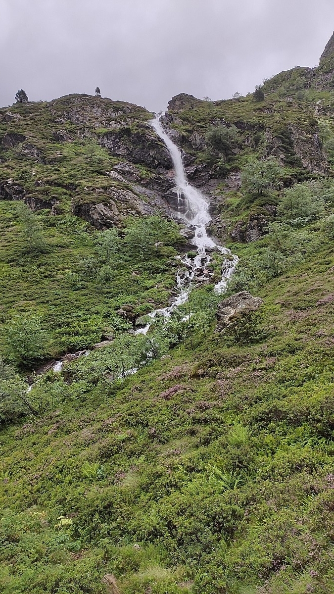 A l'exception de quelques kerns sur les premiers hectomètres de la descente, le fléchage disparait au fur et à mesure que je m'enfonce dans la vallée. Heureusement, je dispose de la trace sur ma montre pour confirmer que je suis bien toujours sur la bonne voie. C'est d'autant plus appréciable, qu'il n'y a désormais plus de sentiers. Je navigue le long d'un torrent, enjambant parfois les rhododendrons qui parsèment la descente. Ce n'est qu'une fois ma randonnée terminée que je comprendrai que c'est le torrent qui avait pris possession du sentier. Comme je l'ai dit plus haut, il a beaucoup plu ces derniers jours.