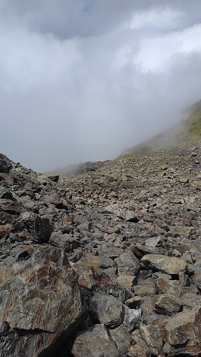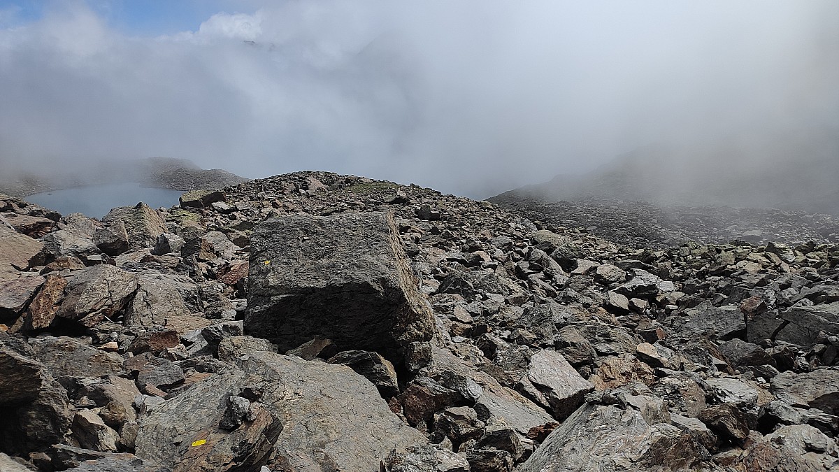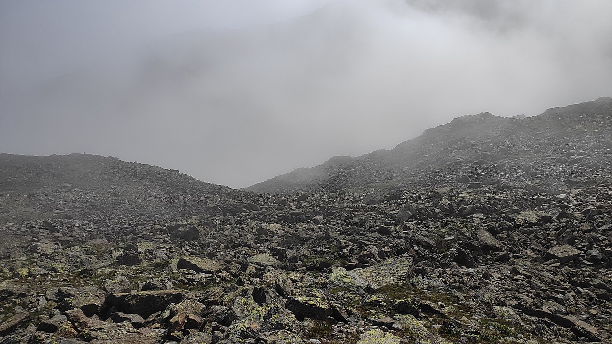 Pour couronner le tout, je finis par évoluer dans un complet brouillard. Il me faudra presque une heure pour en sortir. Durant ce laps de temps, la coulée de roches qui me servait de guide pour assurer ma progression, a fait place à un véritable chaos minéral qui s'étend sur tout le flanc de la montagne.