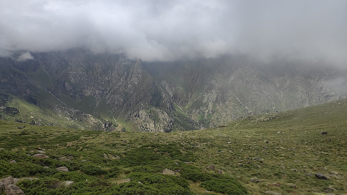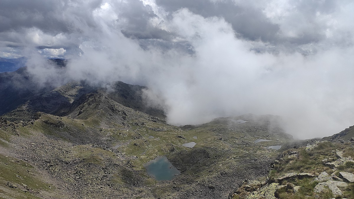 Enfin, j'atteins le col de la Oussade à 2738m. Je constate que de l'autre côté, le fond de la vallée, vers lequel je vais plonger tout à l'heure, est bouché par un épais brouillard. En tournant le regard sur ma droite, je vois se dresser le majestueux pic Malcaras. Il ne me reste que quelques centaines de mètres pour atteindre son sommet.
