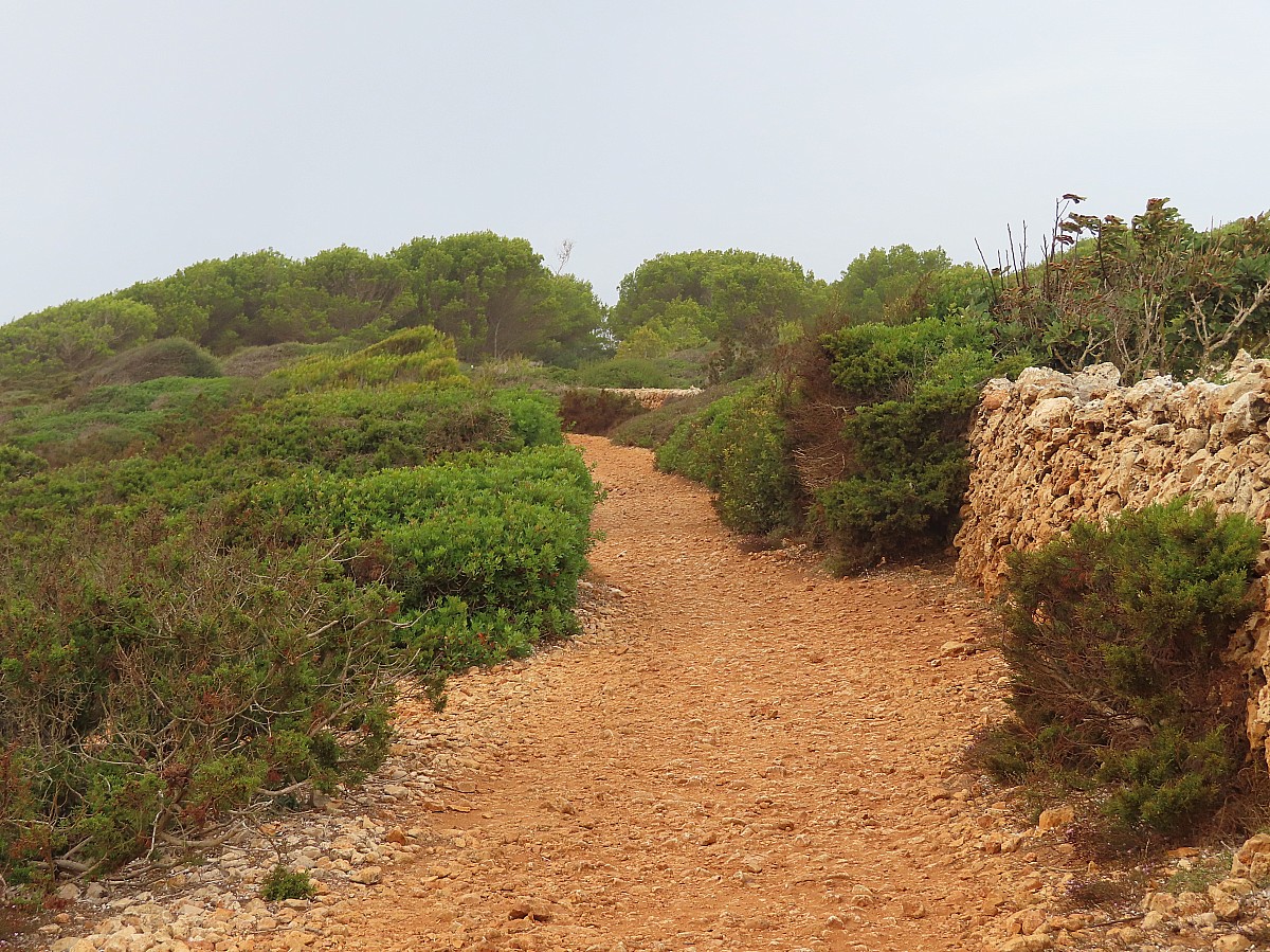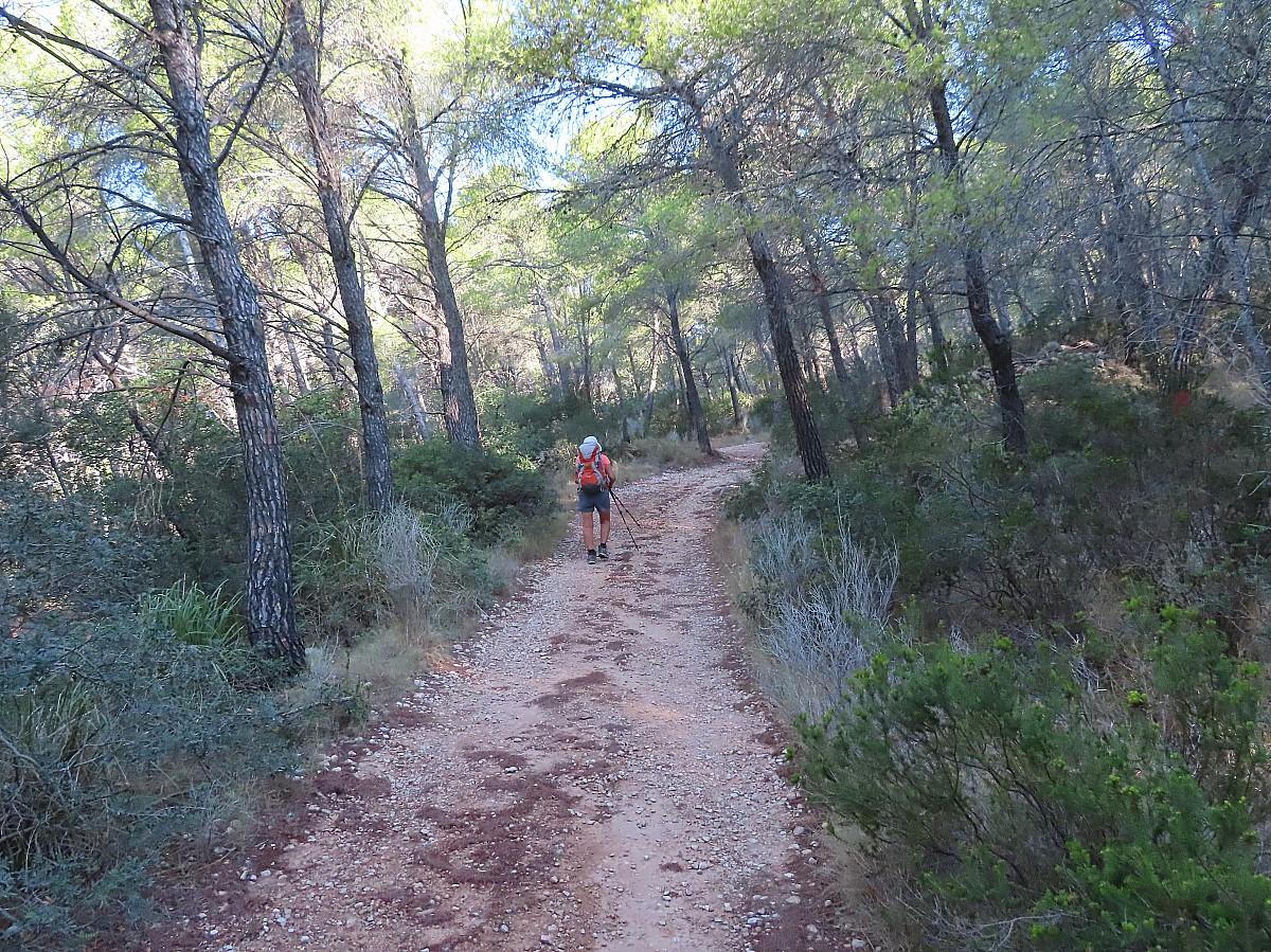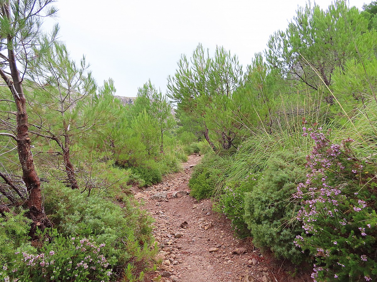De la Finca, on suit le cami dels Cellers jusqu’à une maison en ruine, la caseta des carabinero, puis on prend de la hauteur jusqu’au Pas Gran en repérant le sentier par des cairns de pierres (absence de balisage). Nous traversons la plaine d’En Cabrit, une zone naturelle protégée et montons par d’anciennes terrasses au Pas d'Esteparet surplombant la mer, puis le point culminant de la journée à la Caseta de Moleta.