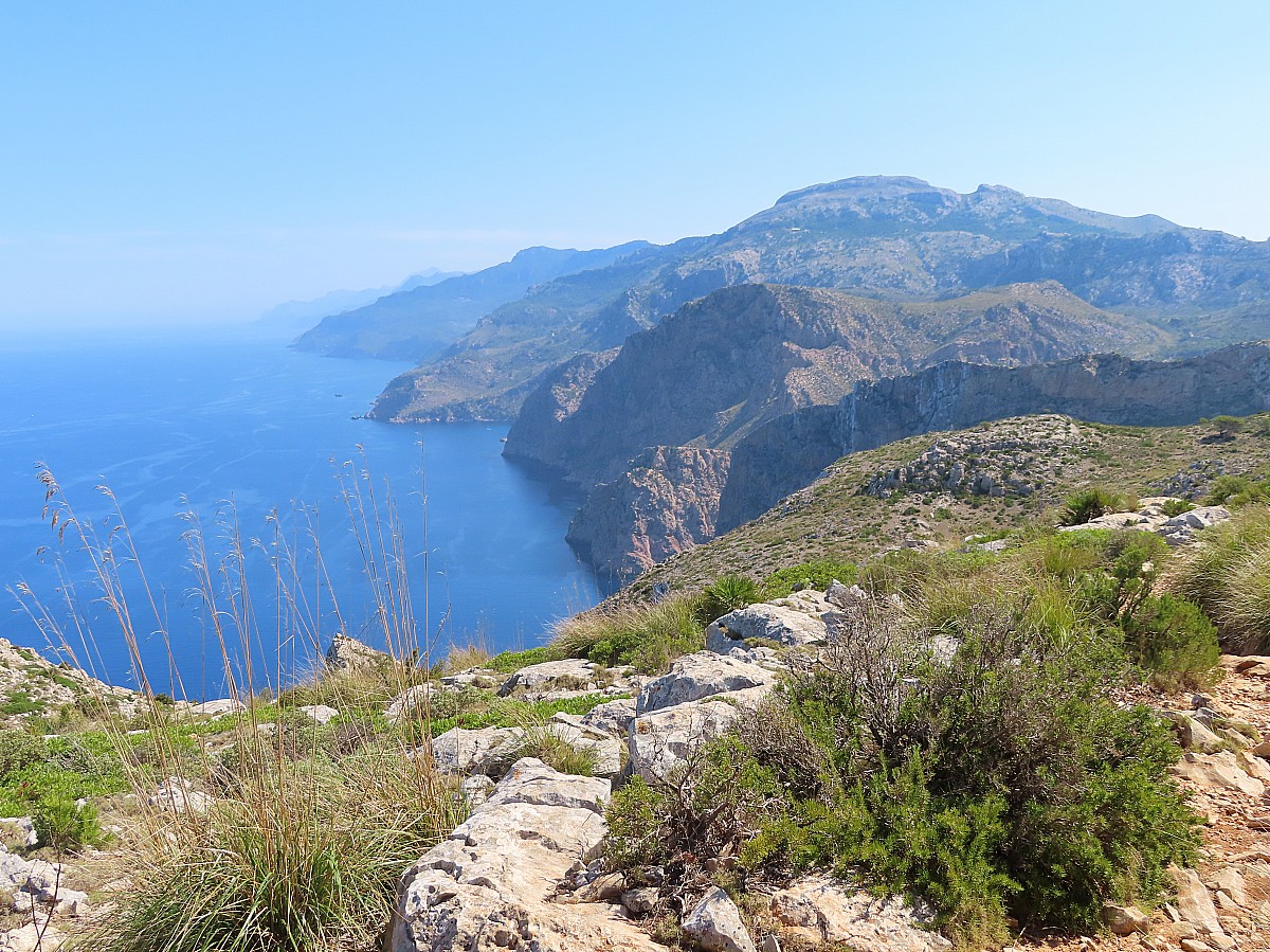 Après quelques tronçons de faibles pentes, nous longeons la face orientale du Puig d’En Ric et atteignons le point culminant de la journée au Pas Vermeil avec un premier point de vue sur l’île de Dragonera.