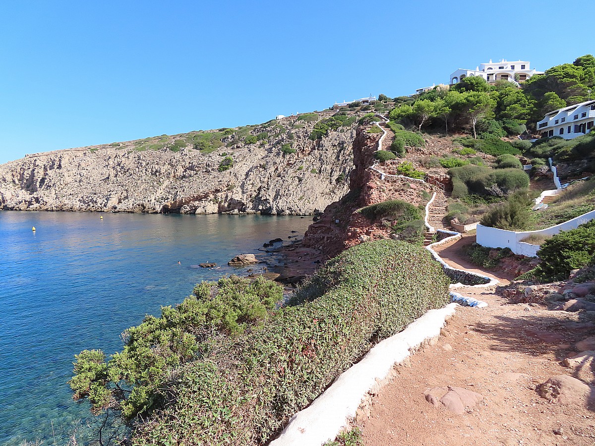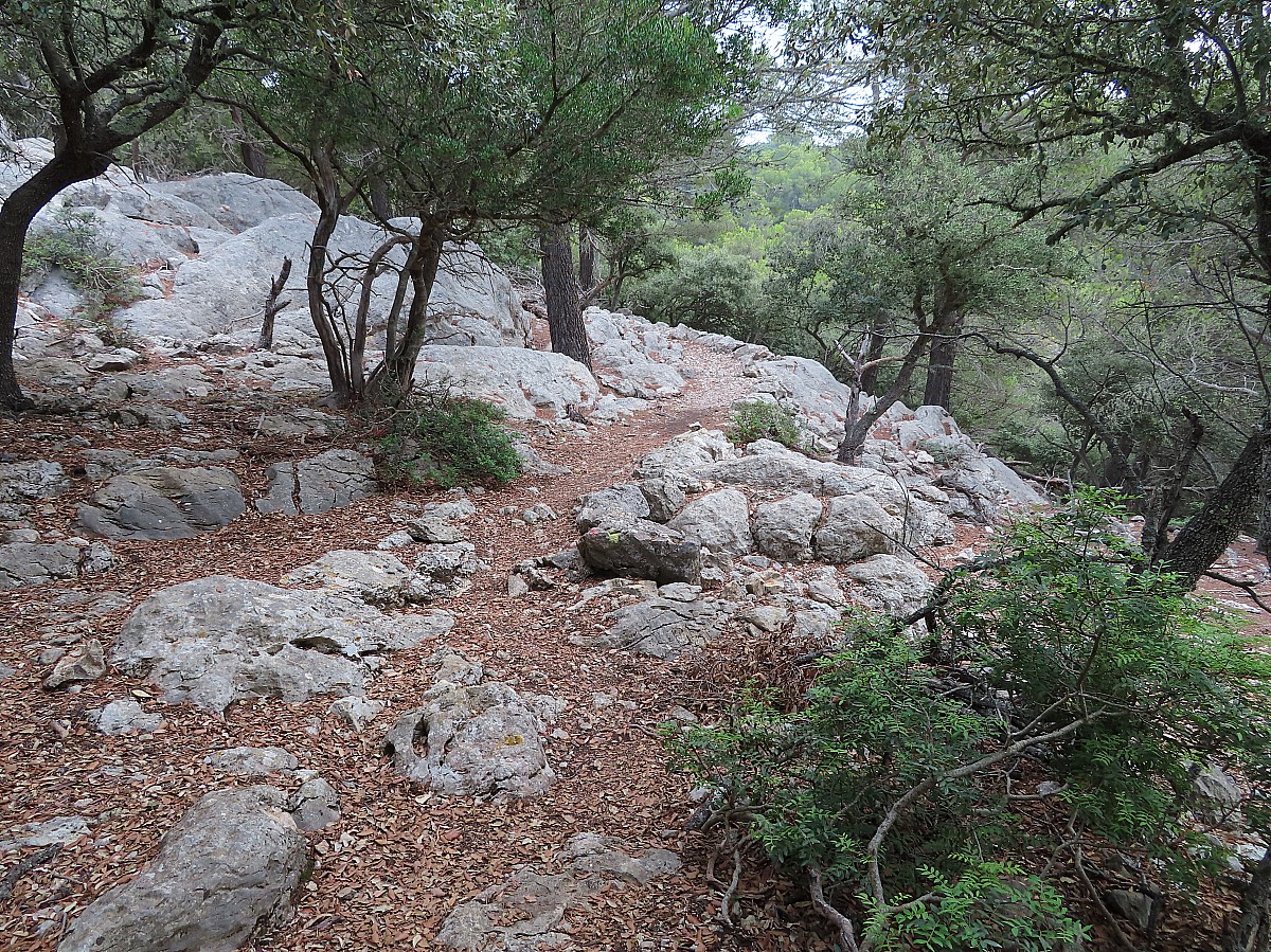 Nous longeons le bord de mer jusqu’à la place Sebastia Grau et prenons le chemin de Trapa direction nord. A Can Tomevi, nous quittons le GR pour prendre sur la droite le cami de Trapa plus accessible. Un agréable sentier dans un paysage minéral qui gagne de la hauteur avec des points de vues au fur et à mesure de notre progression jusqu'au col des Animes que nous franchissons par un passage aérien sur une dizaine de mètres dans les rochers...