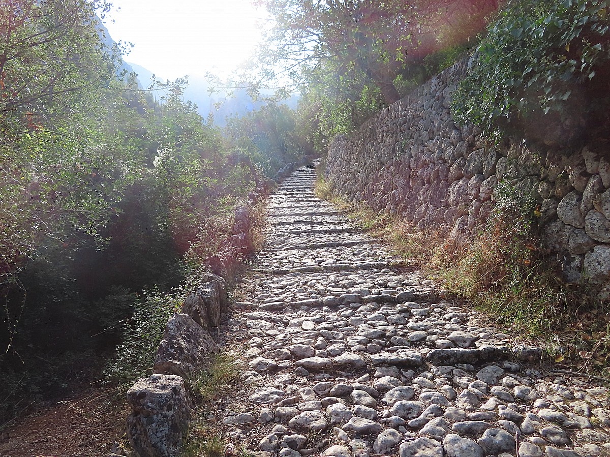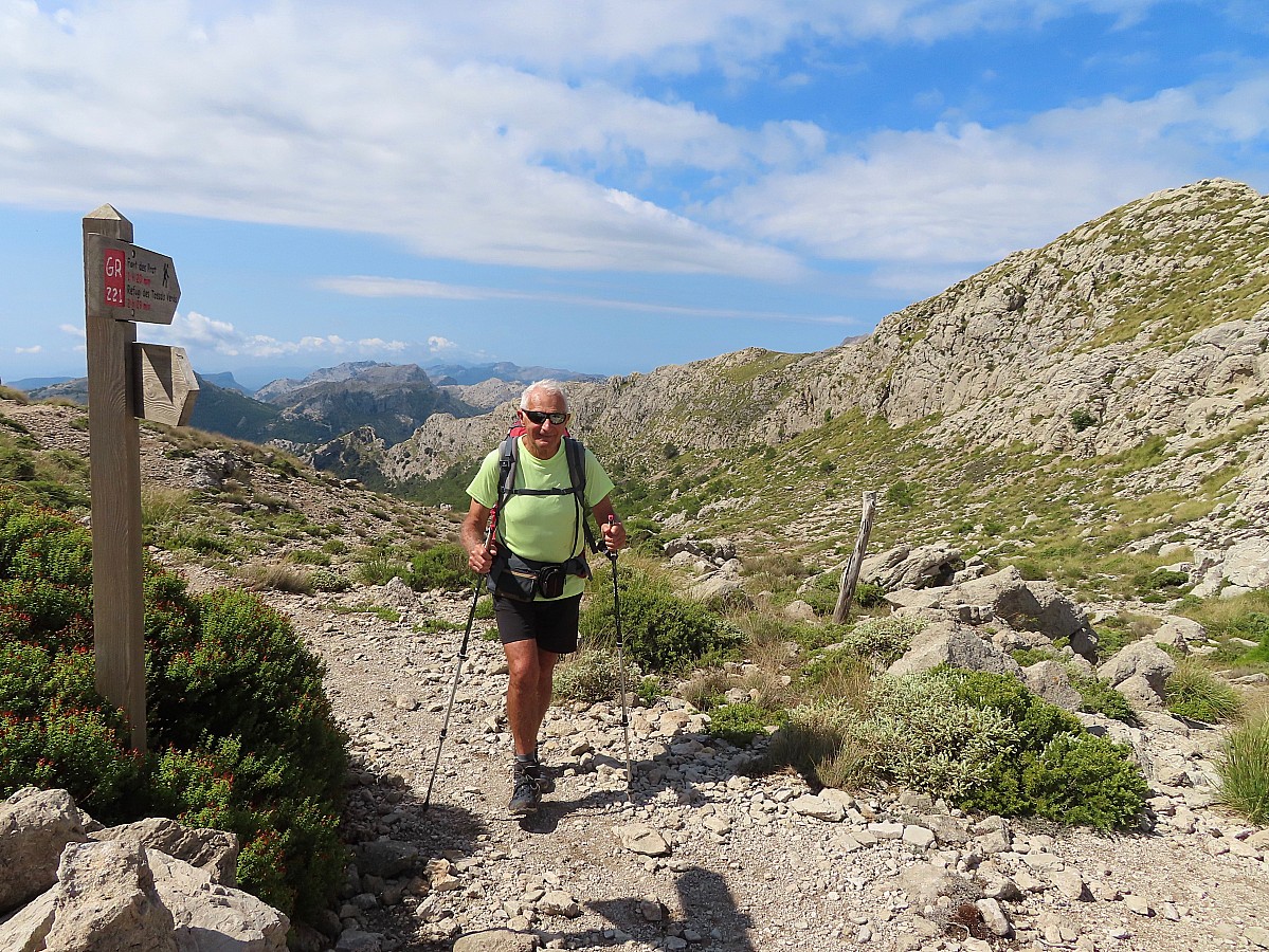 Du refuge nous prenons le chemin inverse de la veille jusqu'à la bifurcation vers Lluc. Le sentier monte progressivement dans une vallée d'altitude bordée de montagnes jusqu'au col des Prat à 1205 m. La vue s'ouvre sur la presqu'île d'Alcuida et la plaine à l'horizon. Après les cols des Telégraf et de Cases de Neu, la descente vers Lluc commence sur un magnifique chemin pavé les Voltes d'en Galileu puis sur un chemin forestier jusqu'à la fin du parcours.