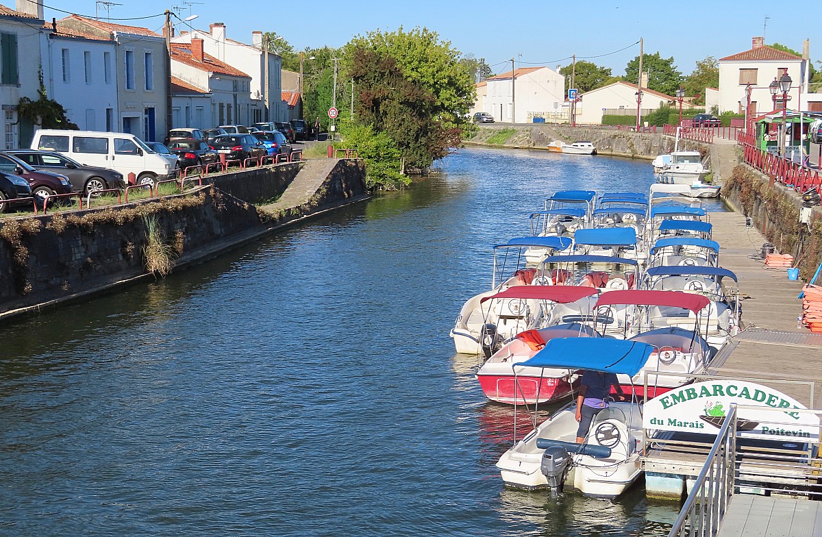 Station balnéaire réputée, la Tranche-sur-Mer voit sa population multipliée par 40, passant ainsi de 3000 à près de 120000 estivants l'été! Nous quittons la ville par l'une des nombreuses pistes cyclables pour rejoindre la vélodyssée au niveau de la lagune de la Belle Henriette. Un endroit unique séparé de la mer par une étroite bande de sable jusqu'à la Faute-sur-Mer. A voir le typique port de l'Aiguillon-sur-Mer, avec ses estacades et pilotis en bois. Nous quittons la côte au hameau de la Dive situé sur un îlot calcaire pour rejoindre par les marais déssechés, Saint-Michel-en-Herm et Marans, une grande boucle de 30km entre digues, fossés et anciens canaux. La cité fluviale de Marans, porte d'entrée de la Venise Verte présente un paysage plus agréable avec ses canaux navigables autour de la Sèvre-Niortaise. Fin de parcours sur la Vélo Francette jusqu'à l'île d'Elle à 5km de Marans.