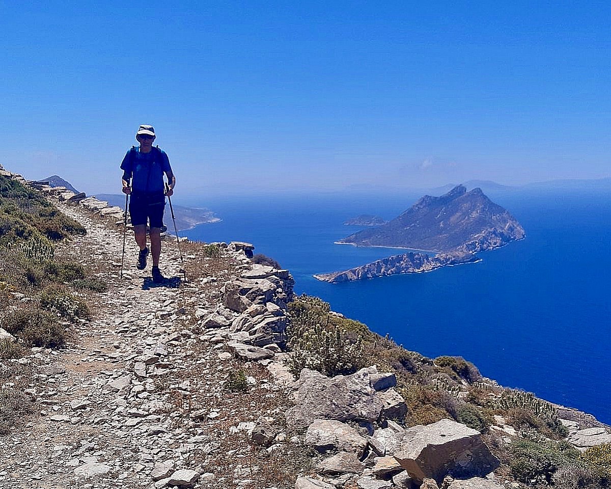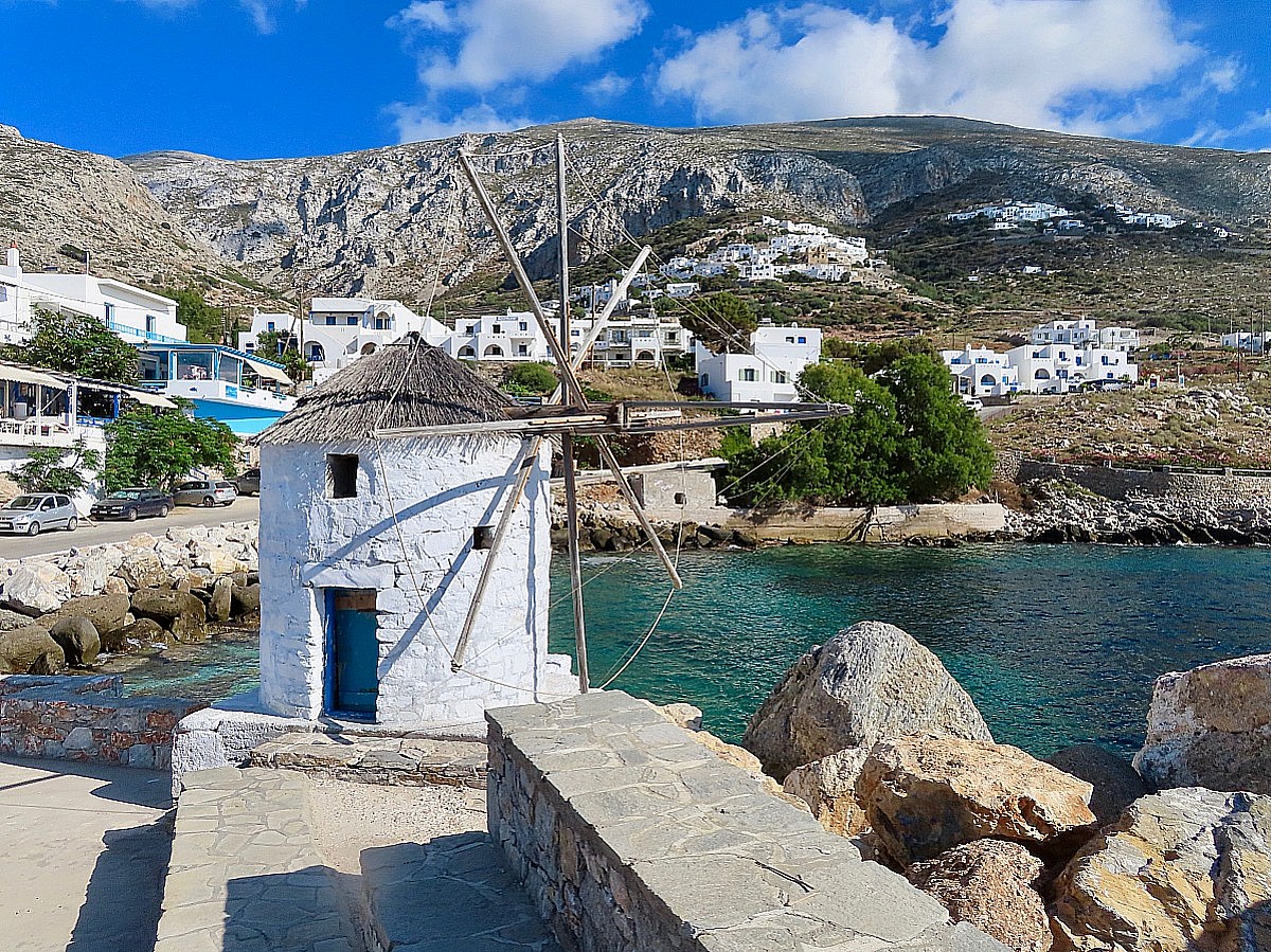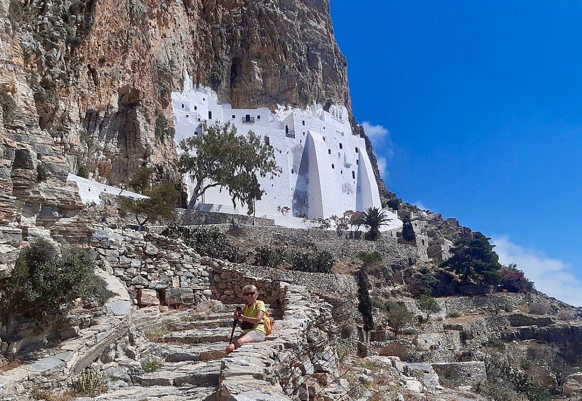 La plus orientale des Cyclades, Amorgos est l'île du Grand Bleu. Katapola, le port principal est situé dans une rade naturelle avec ses maisons blanches étagées sur ses collines tout autour. C'est aussi l'île la plus réputée pour la randonnée. Le sentier entre Chora et Aegiali le long de la crête de l'île avec le monastère de Panagia Chozoviotissa est l'un des plus prisé. Incrustré dans la roche à 300m au-dessus de la mer, le monastère s'étire tout en hauteur sur 8 étages. Nous y sommes accueillis par des moines avec des loukoum et un verre de raki! Deuxième randonnée vers Chora perché sur un rocher avec son labyrinthe de ruelles fleuries, églises bysantines et anciens moulins.