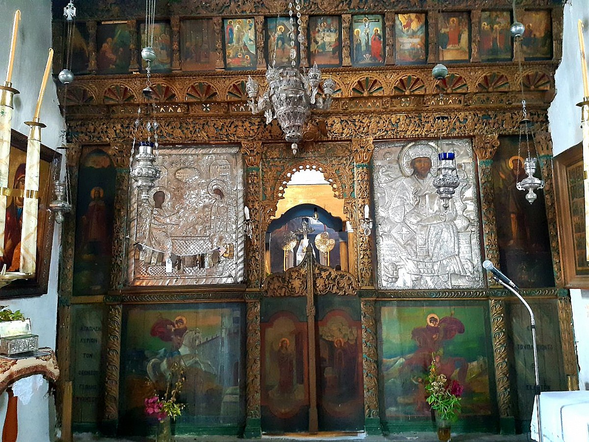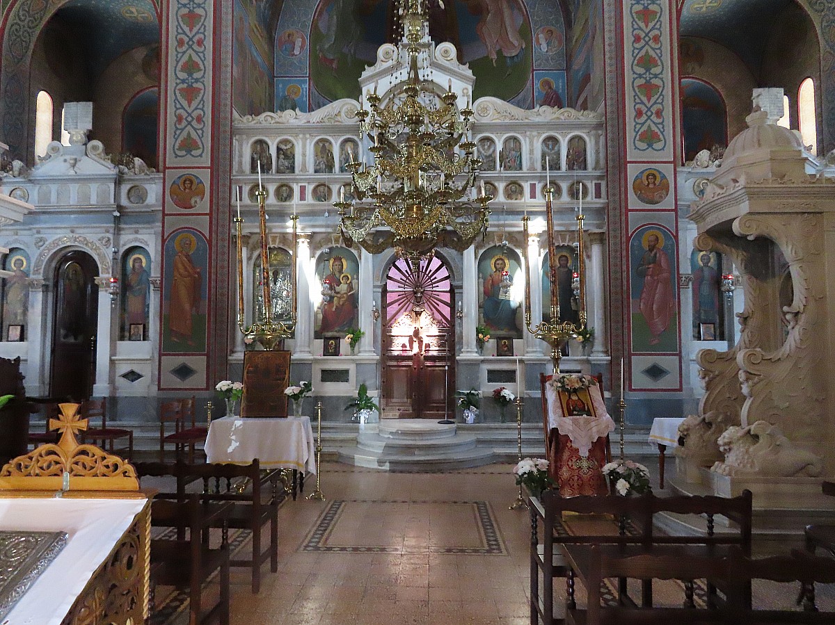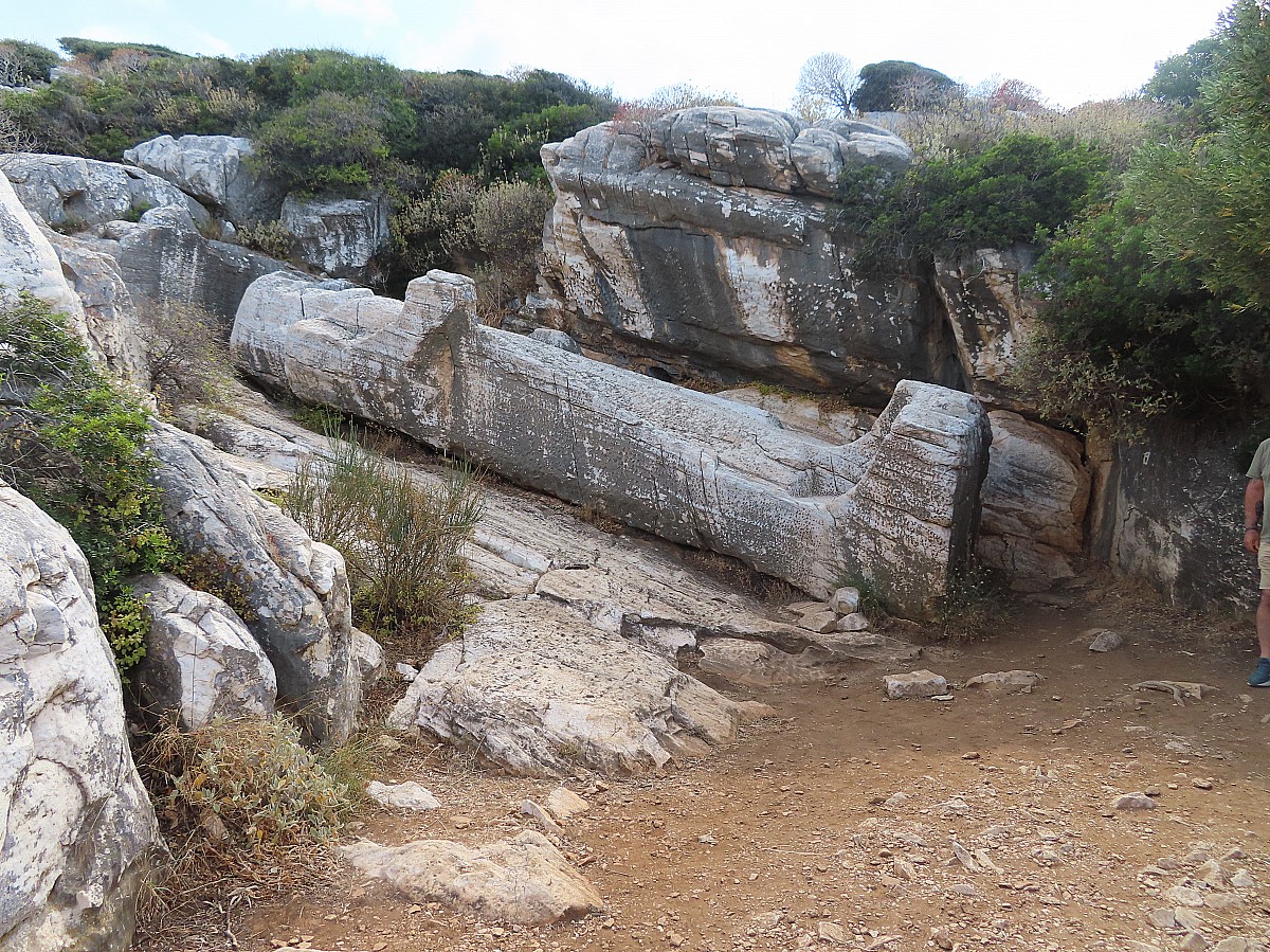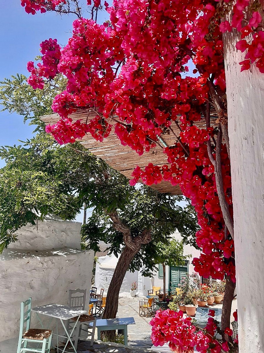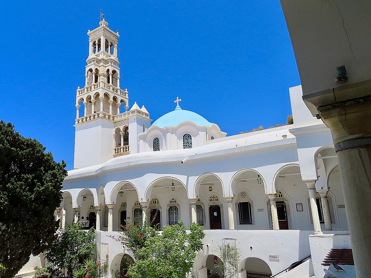 Tinos est réputée pour sa pierre et son important centre religieux au port de Chora. Juchée sur les hauteurs de la ville, la Panagia Evangelistria est un haut lieu de pélerinage des grecs orthodoxes. Ancré dans la montagne avec une vue sur la mer, le couvent de Kechrovouni est ouvert à la visite, mais la soeur moniale à la porte d'entrée a jugé que notre tenue n'était pas compatible! Excursion en bus le lendemain vers Pyrgos, le village de marbre. De superbes vues sur la mer et la vallée de Tarampados avec ses pigeonniers vénitiens. L'île en comptait 640, l'élevage des pigeons favorisait la fertilisation des sols. Fin de la journée par une boucle de randonnée vers le petit port bleu et blanc de Panormos, où autrefois les navires chargeaient le marbre.