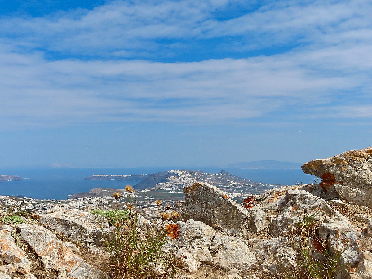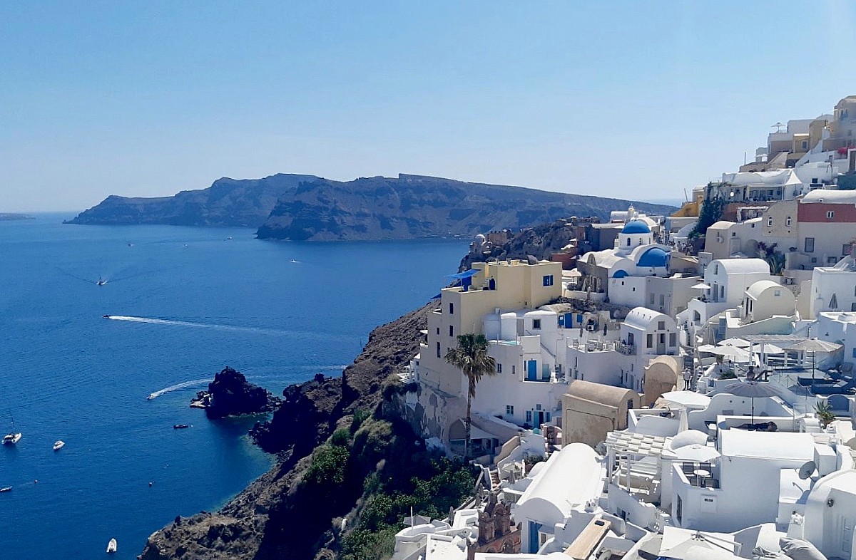 Une arrivée inoubliable sur l'île de Santorin à l'approche du ferry vers le port d'Atinios. Trois randonnées découvertes spectaculaires, la première entre Fira et Oia sur la via Imerovigli le long de la falaise surplombant la Caldera, la deuxième vers le pittoresque village de Pyrgos et le mont Profitis Ilias point culminant de l'île, la dernière vers les villages de Megalochoro et Akrotiri situé à proximité du site archéologique le plus impressionnant et conservé des Cyclades.