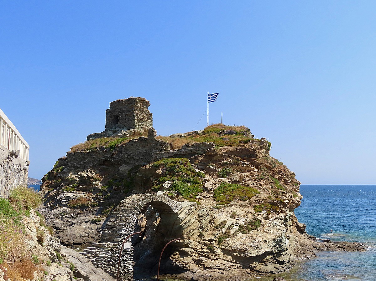 Changement de décor pour Andros, la deuxième plus grande île des Cyclades est luxuriante et plantée de platanes et de cyprès. Les toits des maisons en tuiles rouge ont détroné les cubes blancs! Les ferries s'arrêtent à Gavrio, port sans grand charme. Après notre installation à l'hôtel nous prenons un taxi pour visiter Batsi, un petit port de pêche accroché à la colline face à la mer. Le lendemain, excursion en bus vers Chora, la capitale de l'île. Le village, ancré sur un promontoire rocheux s'étire sur la mer. Les rues et escaliers pavés de marbre sont bordés de maisons d'armateurs évoquant un riche passé. A la pointe du cap, la statue du marin inconnu veille sur les ruines d'un kastro vénitien.