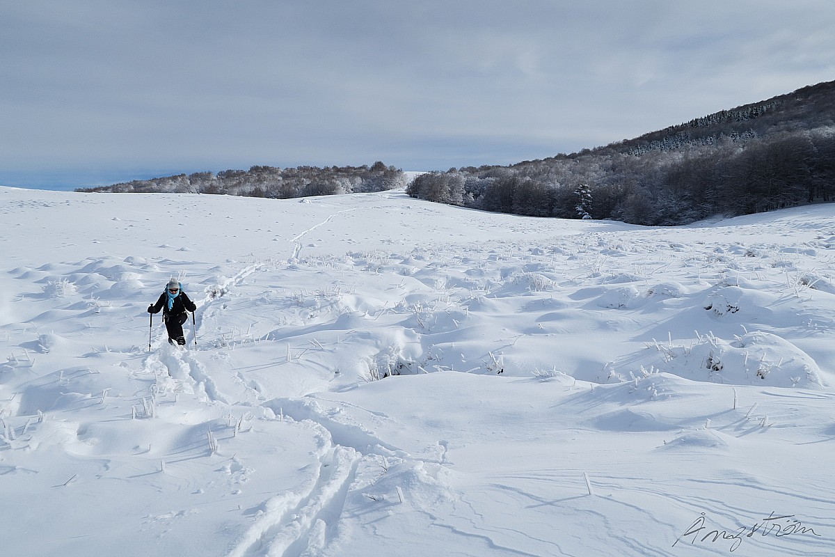 Nous jouons à trouver le meilleur itinéraire pour franchir les nombreux ruisseaux qui drainent cette prairie, en essayant d’éviter de nous retrouver les skis dans l’eau. Les traces laissées par les animaux sauvages sont nombreuses. Ici un cerf ou un chevreuil ; ici une famille de sangliers.
