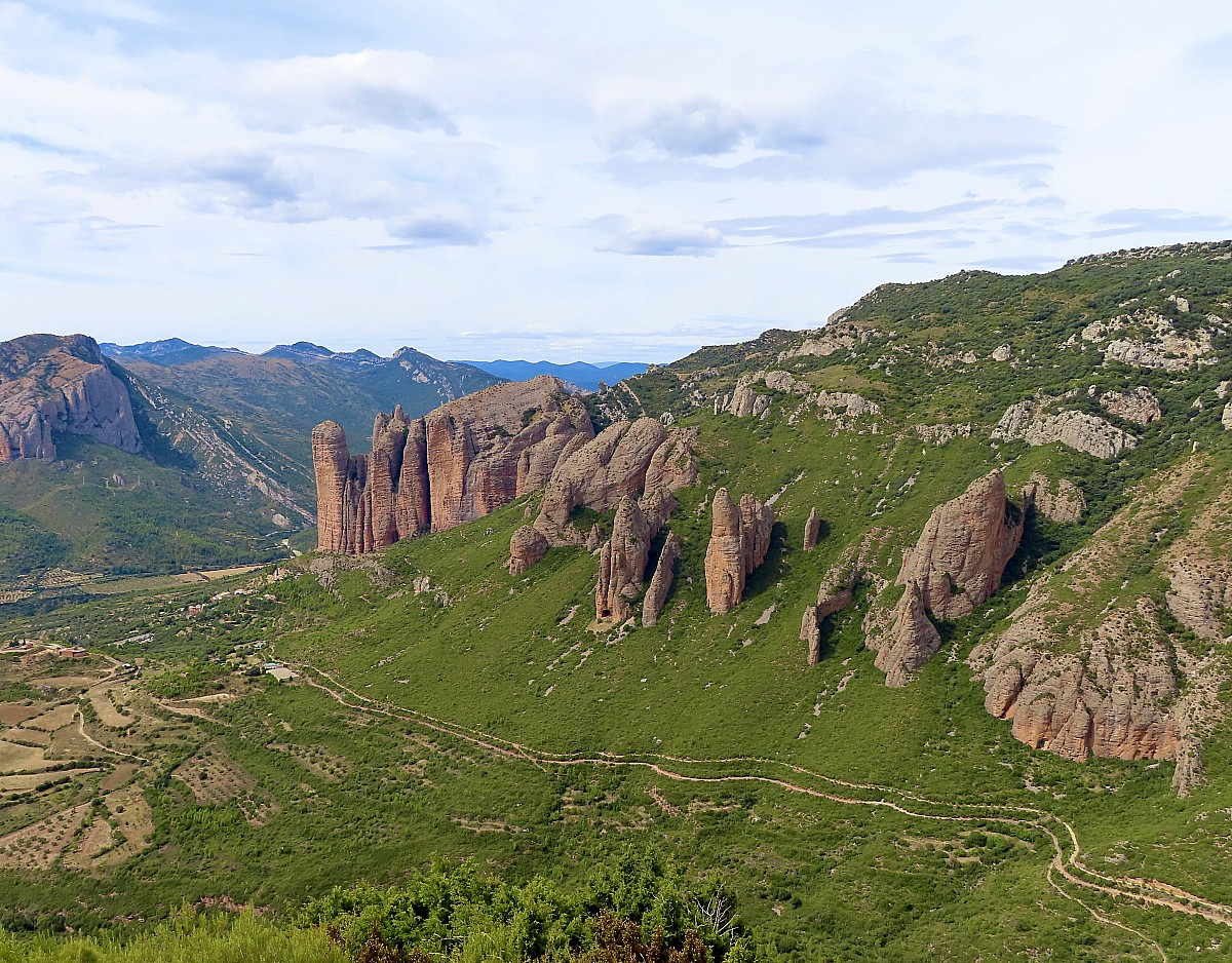 Depuis ce décor de carte postale, nous suivons le sentier des canyons de Barello et de Buera pour rejoindre les Mallos d'Agüero. Moins connus que ceux de Riglos, ils n'en sont pas moins impressionnants. Le circuit contourne les falaises et offre des vues saisissantes sur le village d'Agüero et son église romane du XIIe siècle. Retour à Murillo par le Camino de Huesca, un ancien chemin de pèlerinage reliant Barcelone à Saint-Jacques-de-Compostelle.