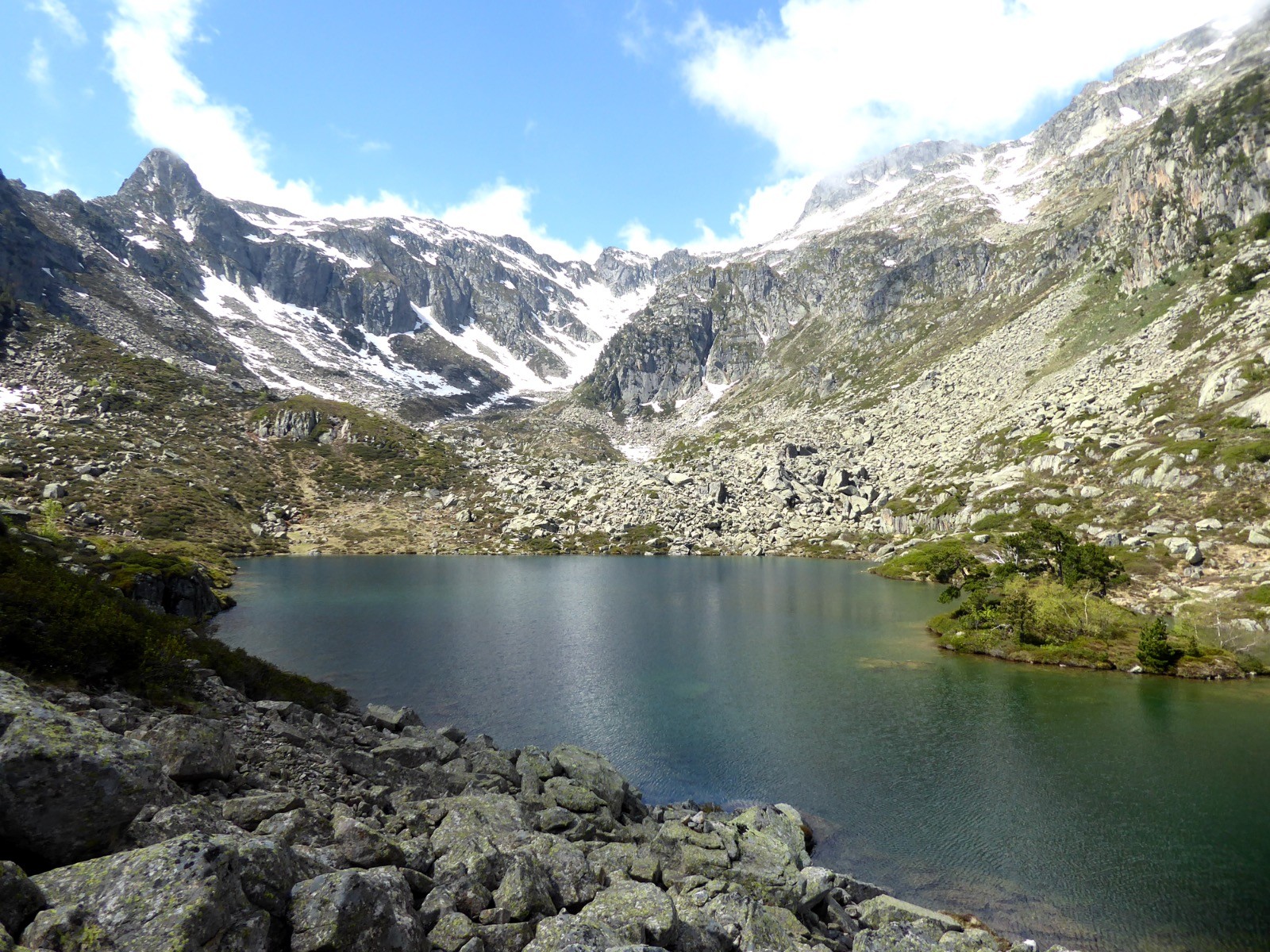 Le lac de Bastampe est au creux d'un petit cirque que dominent d'ouest en est: le Pic de Bastampe ,le pic des Cardis et le Pic de Litouèse que l'on devine car on est un peu bas et enfin la crête édentée du Soum de Nasséoube en dessous de laquelle passe la conduite forcée sur laquelle on arrive depuis la cabane des Estarous. Nous avons choisi de passer par un itinéraire plus sportif qui utilise la main courante, et nous sommes donc partis à gauche à la conduite , cela demande d'être attentif .......une centaine de mètres .Ne pas faire cet itinéraire avec des personnes sujettes au vertige.A signaler également la belle hêtraie , qui nous a permis de monter ...( à l'ombre) ainsi que la descente !! Paysage minéral au-dessus de la hêtraie.Depuis le lac ,vue sur le Pic du Midi de Bigorre , le cirque de Barrada, et le pic de Cumiadères . Il y avait encore une peu de neige sur le Létious. Journée superbe pour cette belle course.Un itinéraire pour montagnards.