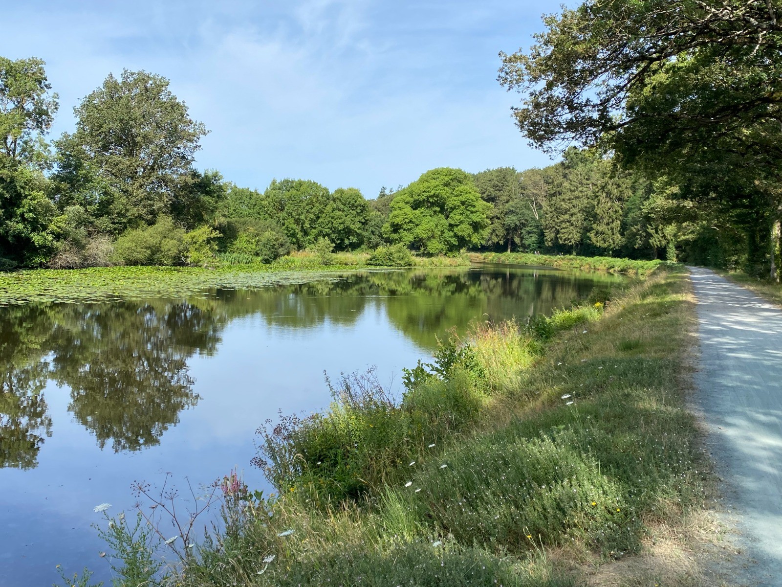 Chemin de halage très ombragé et emprunté par les cyclistes qui se lancent dans le challenge de faire le canal de Nantes à Brest.