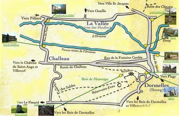 dans le tourant admirer les vestiges du Fort de Challeau, passer trois petit pont avec les fausses rivières et l'Orvanne, sur laquelle on peu encore voir le moulin. Prendre à dorite dans la vallée de Dormelles et continuer tout droit. Passer le moulin de l'Aunoy et arriver sur la D120E dans le Bas de Hôpitaux. A la coix Saint-Vincent continuer sur la droite, passer de nouveau l'Oravnne avec son lavoir et joli pont, au croisement prendre à gauche, regarder le porche et les bâtiment de la frme Saint-Gervais puis monter la côte de Dormelles pour revenir au parking.