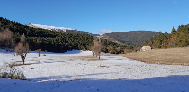 Au sud de Moriez traverser des petites prairies pour rejoindre le sentier montant dans la forêt.