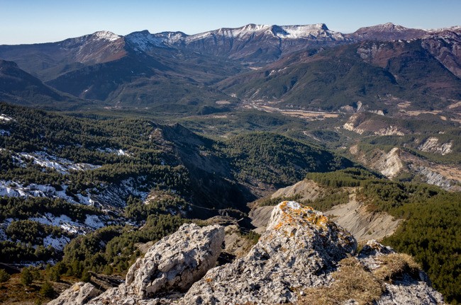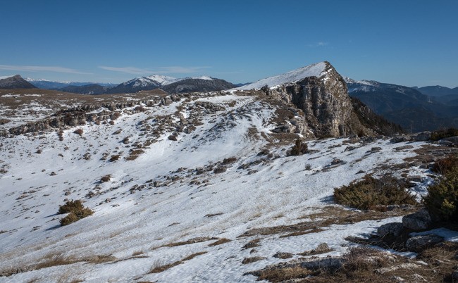 Après le sommet du Castellard, la descente de la crête du loup nécessite de bien s'orienter à travers la végétation et les roches calcaires.
