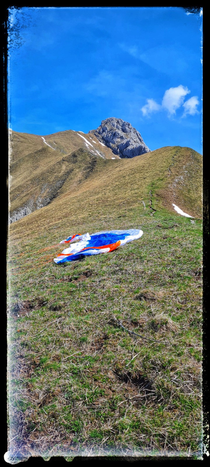 En sortie de déco, la prise en charge est immédiate. La pente est idéale pour un déco. Au survol de la cassure, au niveau de la cascade, ça gigote un peu, mais vraiment deux fois rien. Surpris de ne pas voir le cimetière et la voiture, je cherche un peu du regard ... avant de réaliser qu'il y a un petit relief qui me cache l'atéro. Ce petit relief thermique légèrement. Je repère bien mon approche, et je pose nickel dans un prés fauché, moucheté de bouses fraîches de qualité supérieure. L'atéro commence à être bien alimenté en N-O.