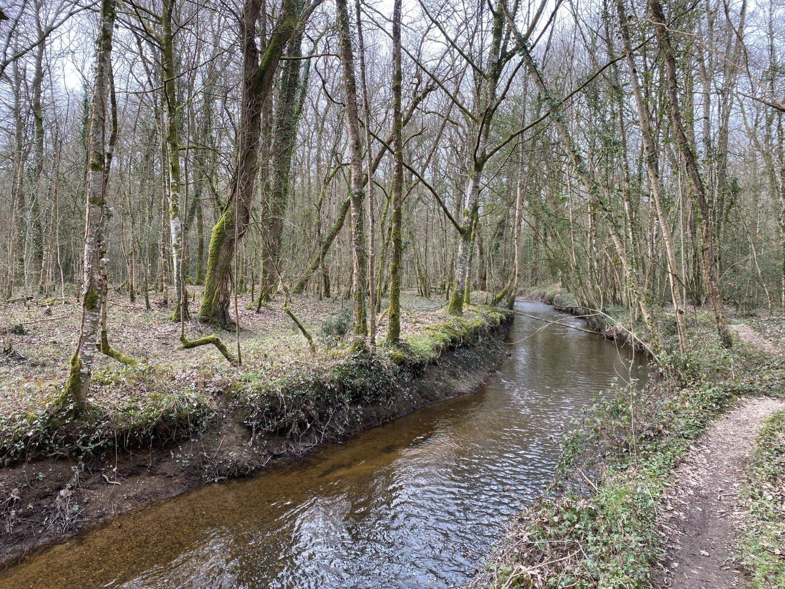 Ce ruisseau a ses berges jonchées d'arbres gigantesques déracinés.