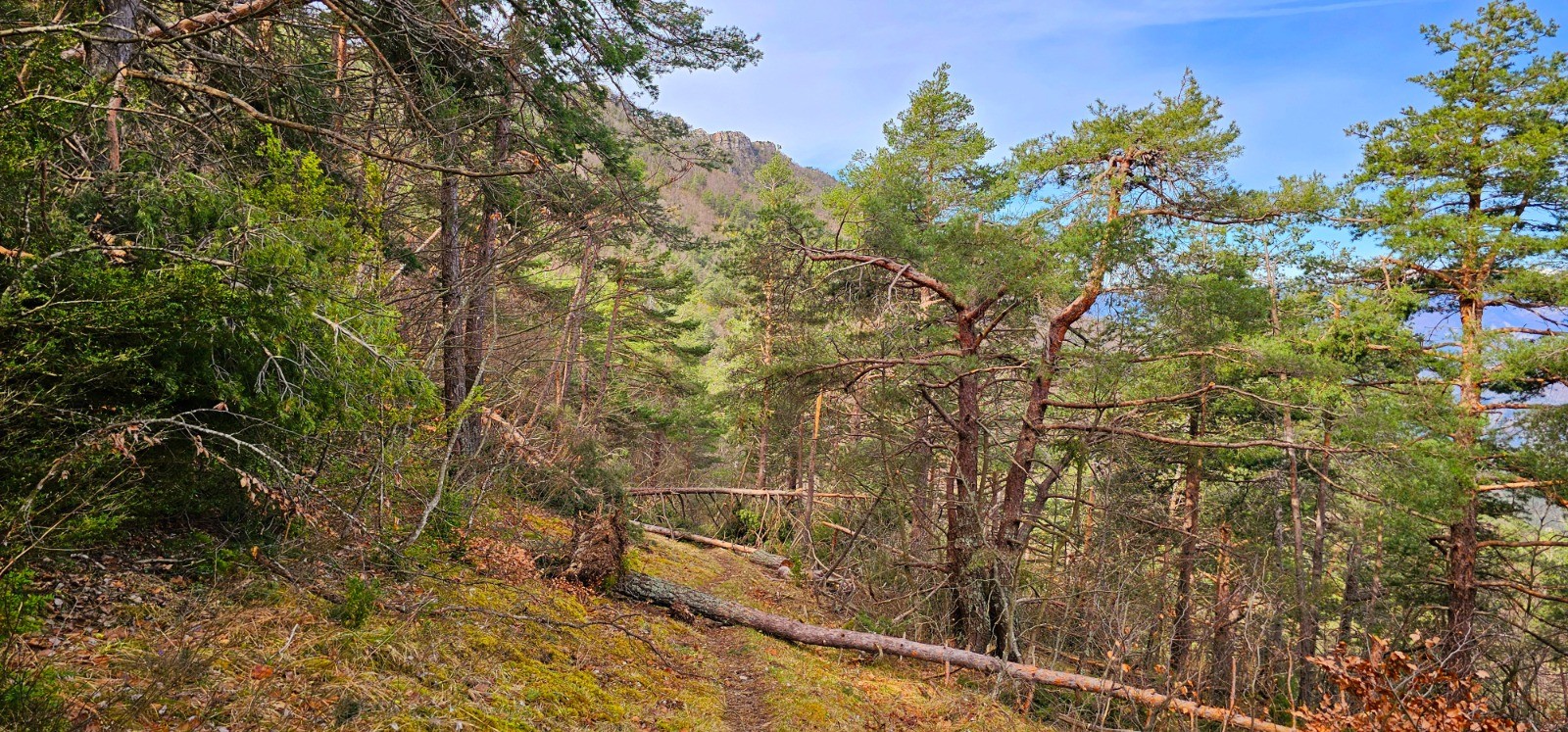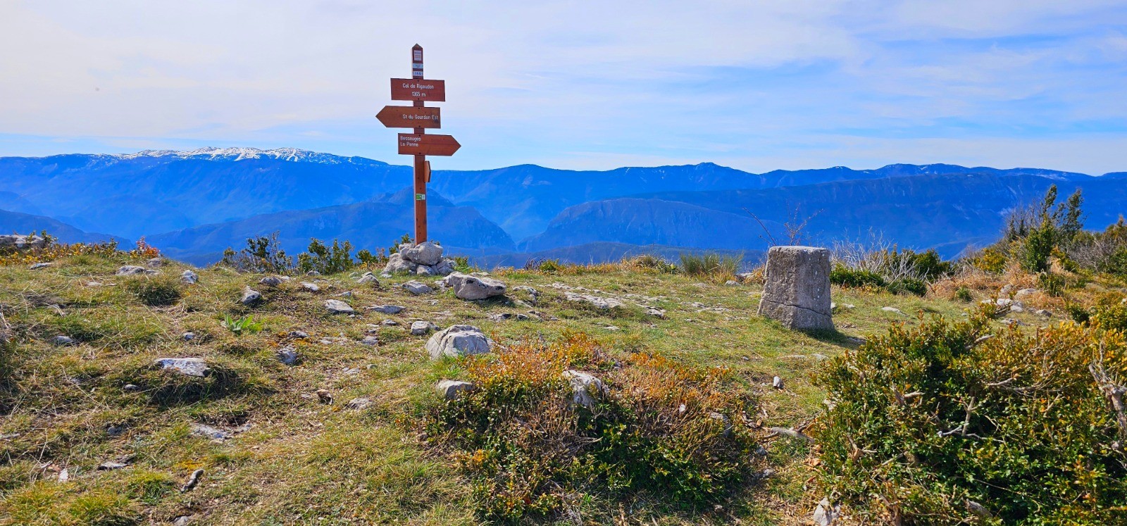 Phase en A/R pour rejoindre le col de Rigaudon à partir duquel on pourrait être tenté de suivre plein ouest la longue crête menant à la 2nde cime de Gourdan (1508 m) distante seulement de 2,82 km pour d+ 118 m mais j'y ai renoncé en l'absence de tout chemin praticable et des difficultés rencontrées pour se frayer un passage au milieu d'arbustes touffus et envahissants.