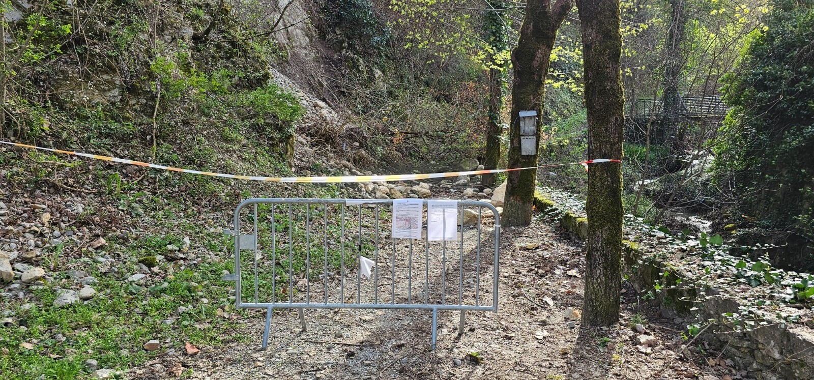 Départ depuis parking situé à l'angle de la D 6202 et de l'Av. Adjudant-Chef Rémond à proximité du pont à haubans enjambant le Var, qu'il convient de traverser pour amorcer le circuit à la balise 150. Il est utile de préciser qu'à la date de cette sortie, un arrêté municipal affiché sur cette borne faisait état d'un "passage délicat entre les balises 150 et 158 à la suite d'un glissement de terrain avec fermeture temporaire". Cela ne concerne en fait qu'un seul point insignifiant situé à proximité immédiate de cette balise 150, sur terrain plat, où un arbre s'est abattu en travers du chemin avec un petit éboulis sur 3 m environ de sentier, que l'on peut très facilement contourner à pied sans technicité particulière (voir photo n° 23). Je n'ai constaté aucune autre gêne à la progression entre les 2 balises mentionnées par l'arrêté.