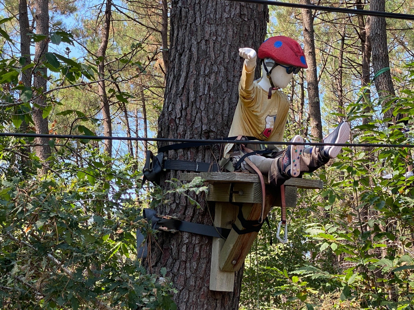Des câbles tendus, des ponts suspendus et des tyroliennes s’étendent entre les troncs robustes, formant un parcours d’accrobranche qui serpente à travers la canopée.
