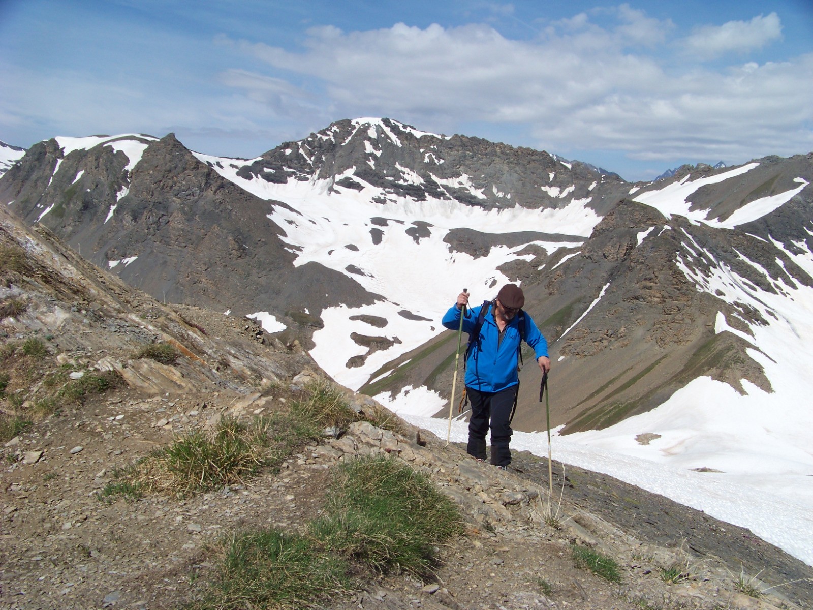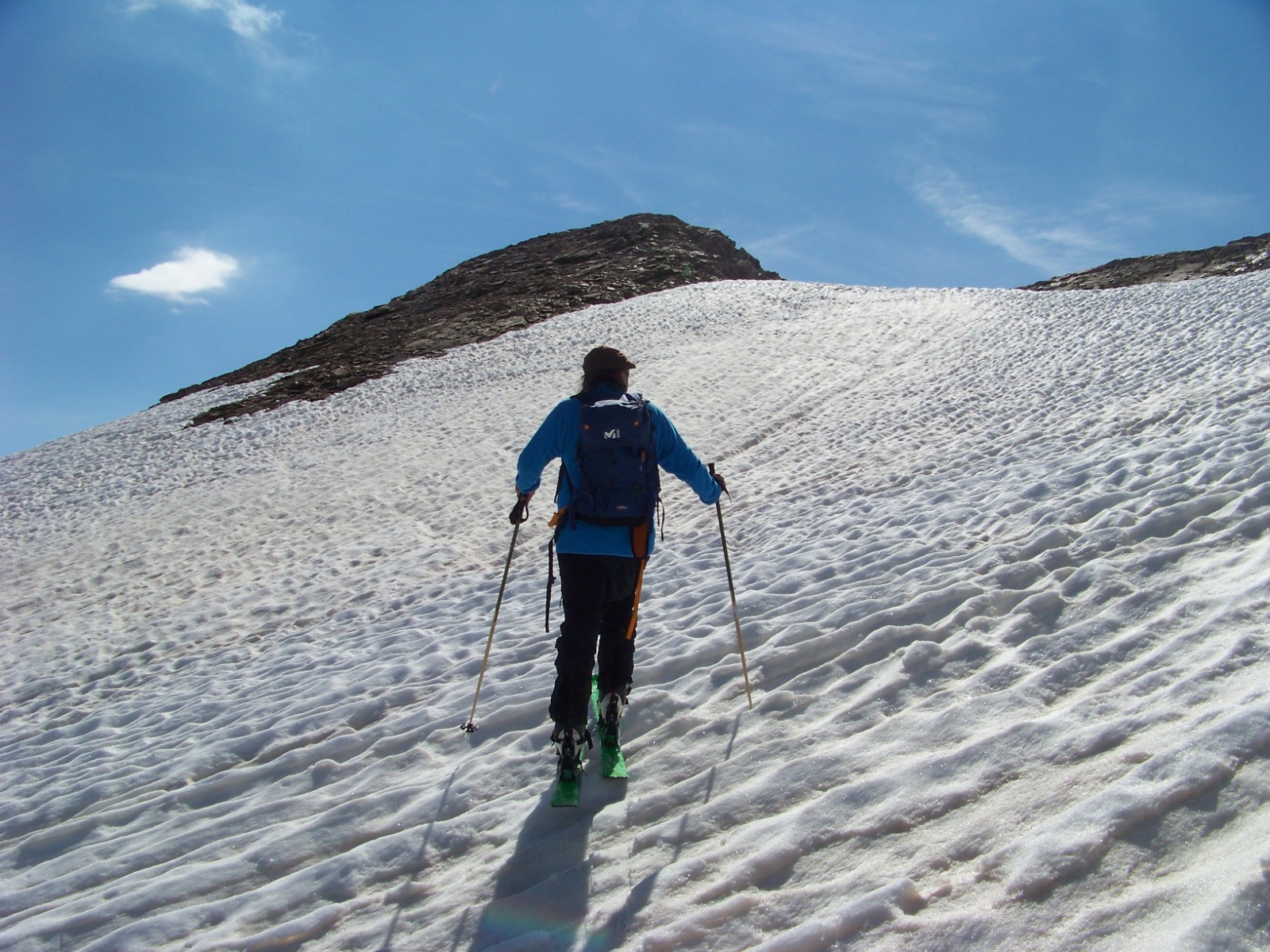 Repeauter 200m pour remonter la pente assez raide jusqu'au col 2850m, puis partir main droite pour rejoindre une des trois pointes de l'Ouille des Trétêtes (La centrale s'atteint à ski. Magnifiques a-pics sur le vallon de la Lenta 800m plus bas!)