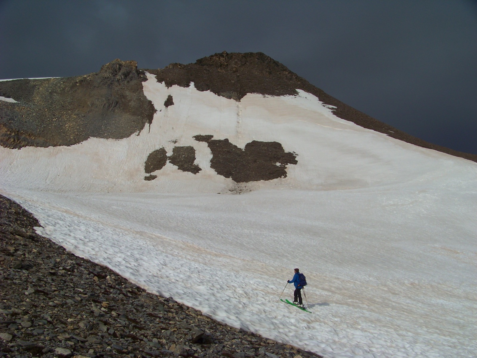 Descente par la facette N de la pointe (pentes à 30°) pour rejoindre le fond du vallon vers 2850m, et se laisser filer jusqu'au lac 2767m.