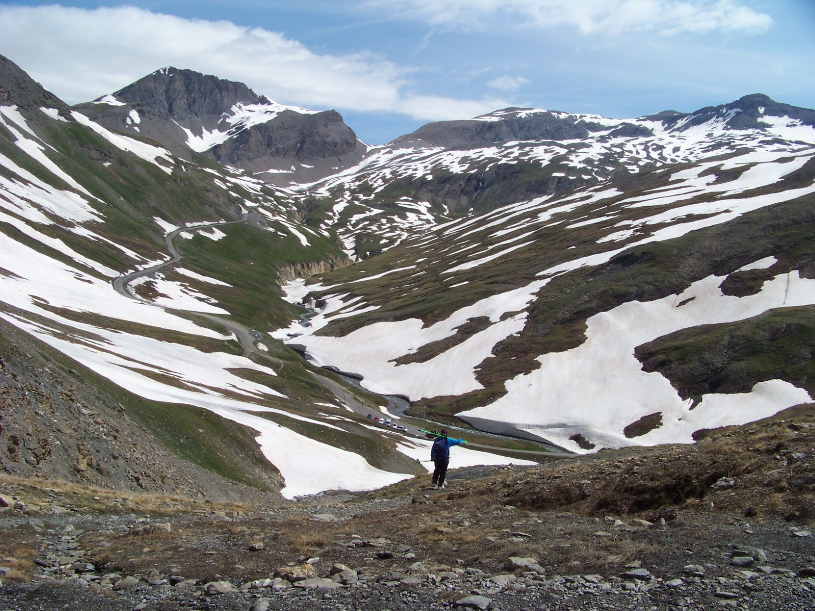 Descente par la pente N douce jusque sur le plateau de l'ancien glacier de la Jave dans le vallon des Illards, puis au pont de la neige par les langues de neige jusque souvent en juillet.