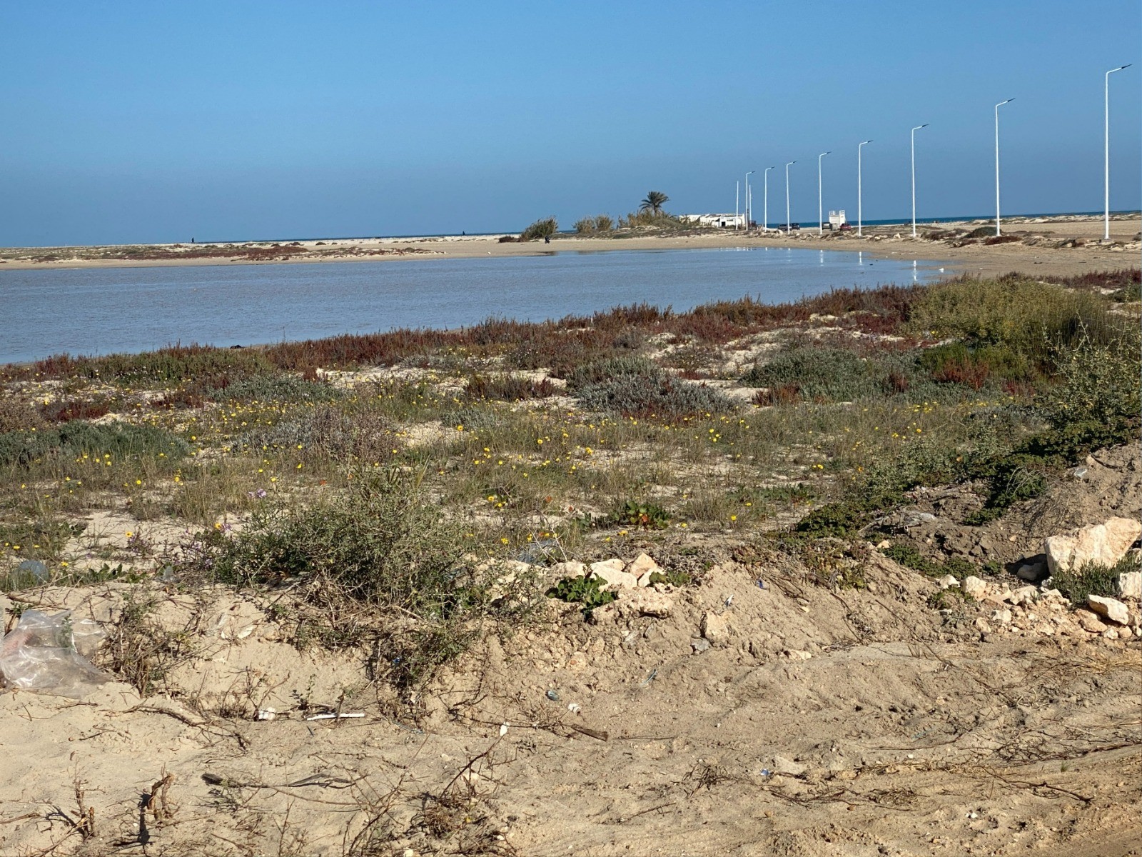 Nous sommes alors au début de la zone touristique : sur notre gauche s’étend la lagune, paisible et lumineuse, tandis qu’à droite s’alignent les hôtels.