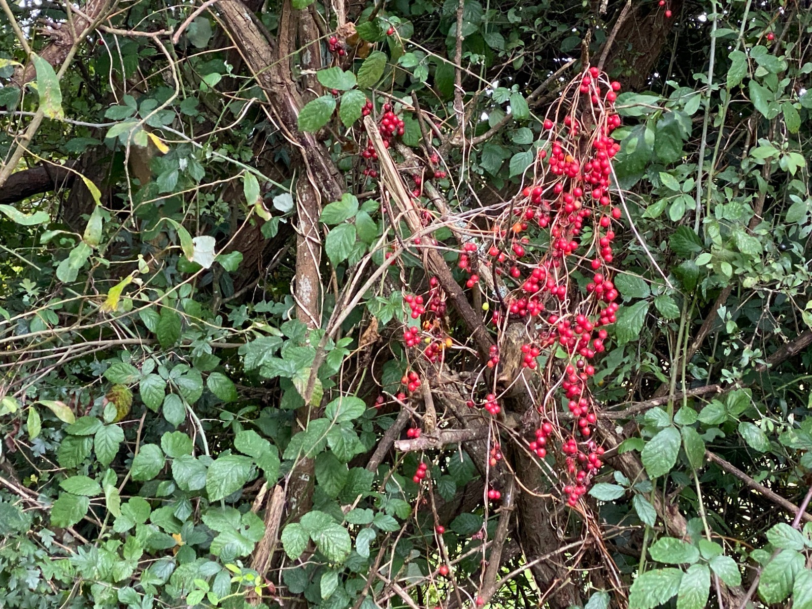 De longues tiges souples s’enroulent autour des arbres, des arbustes ou des clôtures, formant des couronnes naturelles qui donnent une impression de légèreté et de mouvement, il s'agit du fruit du tamier ( photo no 15 )