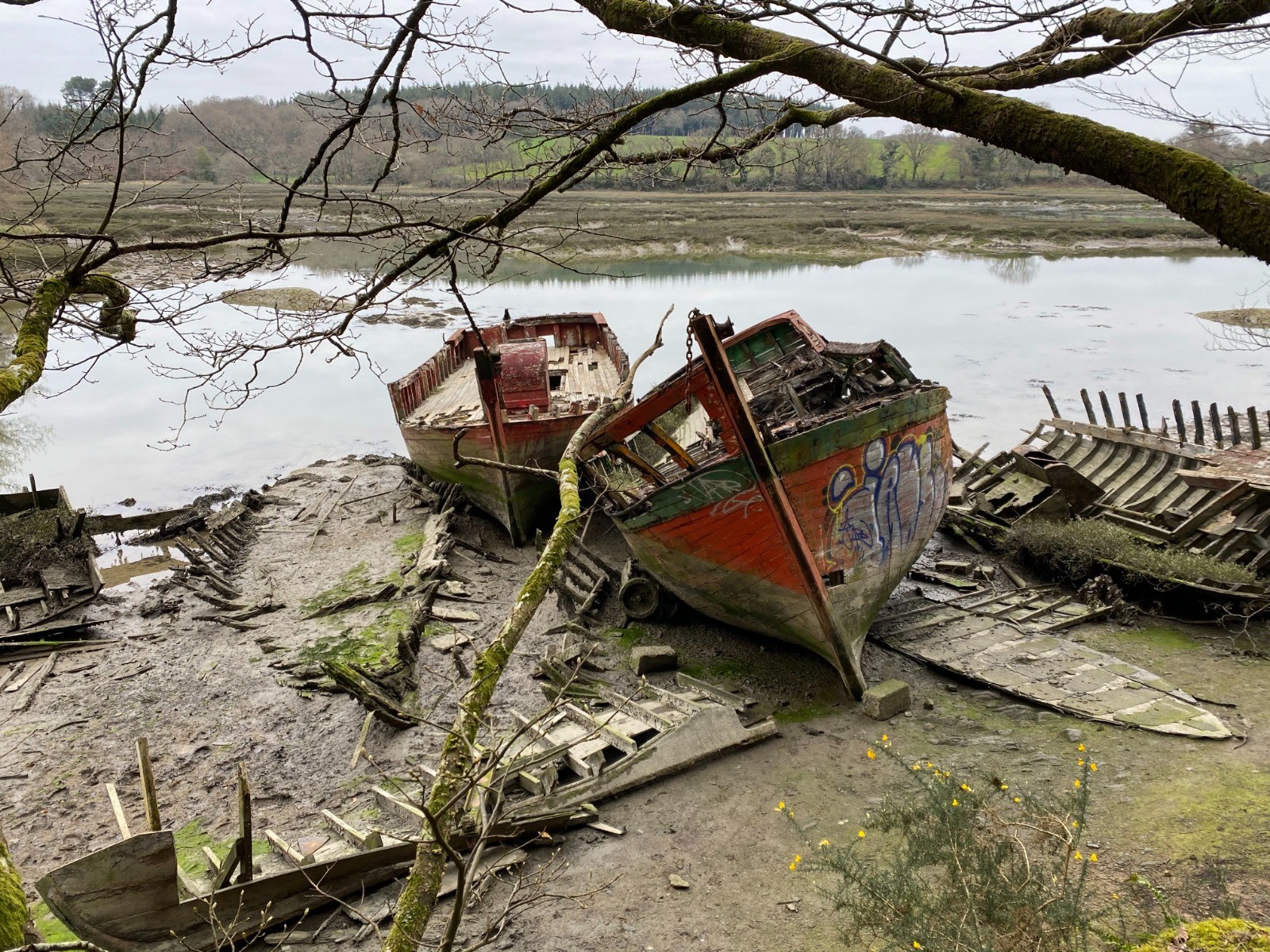 C'est sur le macadam et quelquefois dans des chemins légèrement boueux que nous atteignons Saint Goustan.
