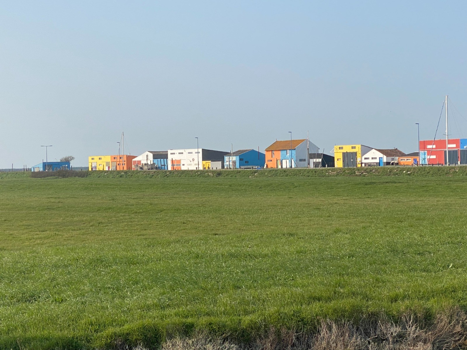 A mi-chemin se profilent des bâtiments colorés intrigants ainsi que le parc éolien de Bouin. ( photos no 4 & 6 )