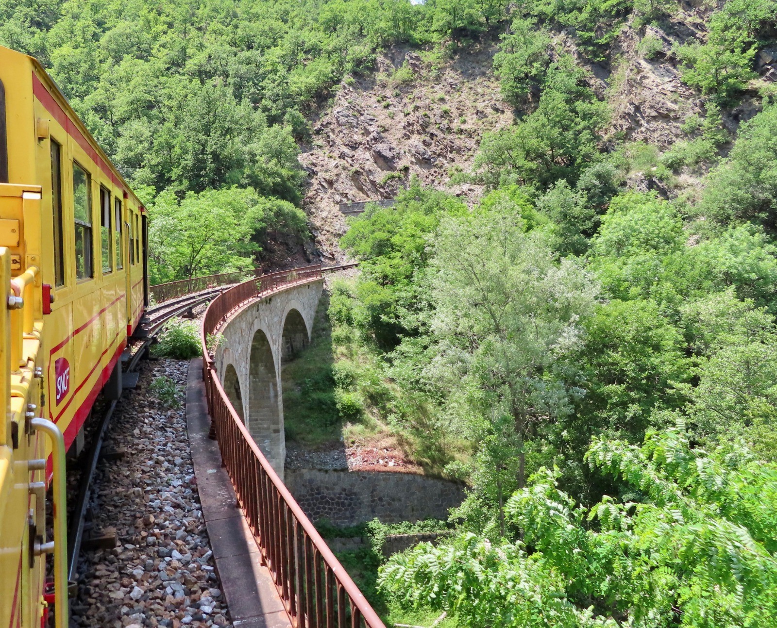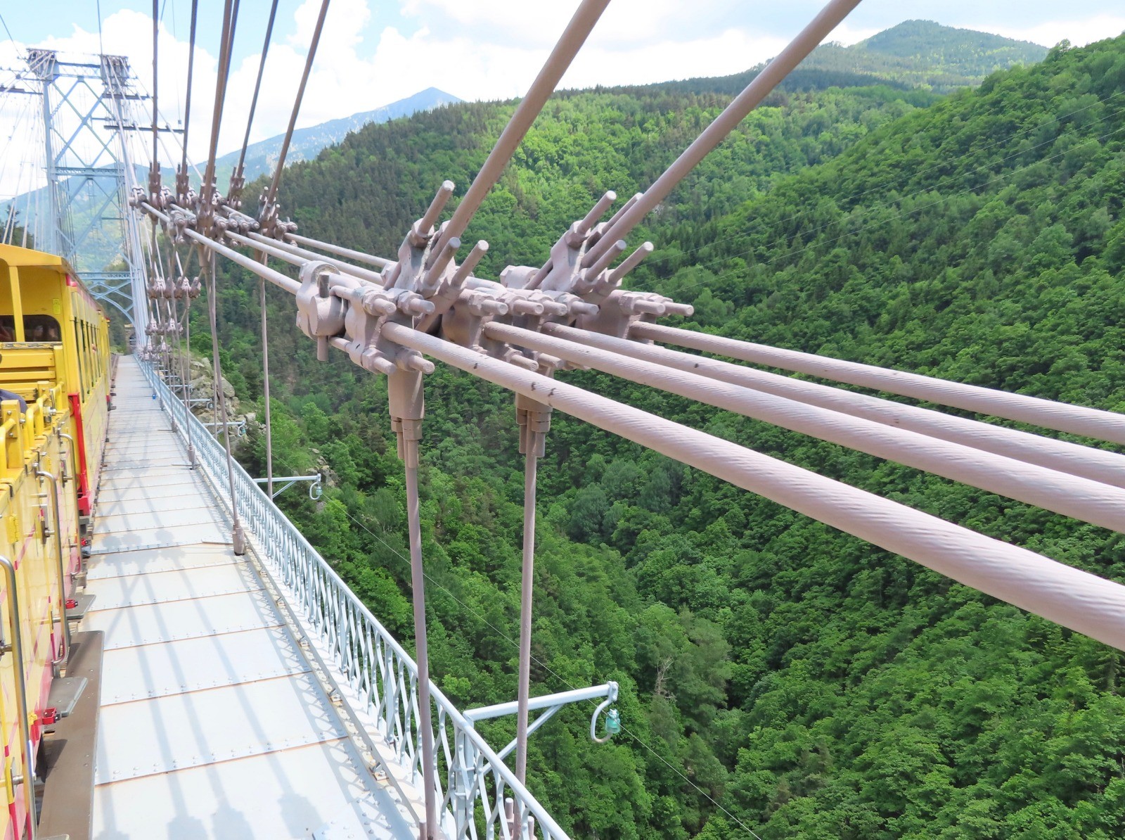 Villefranche-de-Conflent - La Cabanasse - Font-Romeu :Sur le parcours du train jaune, on dénombre 650 ouvrages d'art, dont 19 tunnels et deux ponts tout à fait remarquables : le pont Séjourné et le pont Gisclard, premier pont suspendu au monde. D'une conception impressionnante pour l'époque, il est l'emblème de la ligne. Il a une longueur totale de 234 mètres et une hauteur de 80 mètres, sa construction a duré deux ans, de 1906 à 1908.