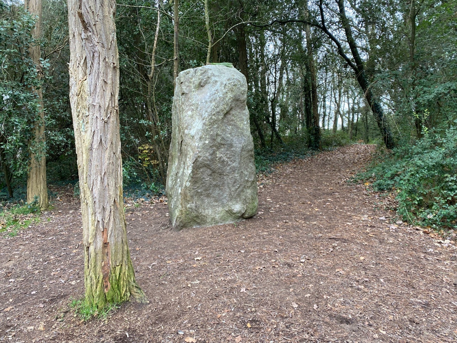 C'est un mégalithe massif entouré d'arbres et de fougères.