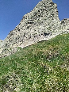 360 mIntroduction Accès à la face ouest de la Cougourde depuis le refuge. Il se termine sur une croupe herbeuse, c'est de cet endroit qu'a été prise la photo associée. Cet itinéraire permet donc d'accéder aux différentes voies d'escalade de la face ouest. Bien repérer cet endroit pour le retou »