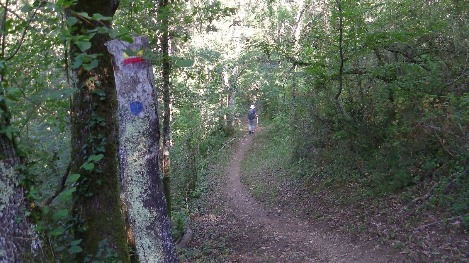 Après quelques tours et détours dans les bois, c'est la descente vers la Dordogne et le canal de Lalinde qui la longe.