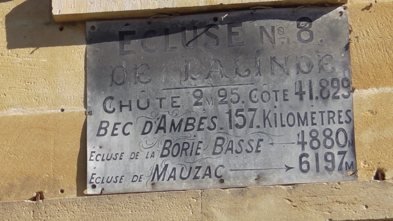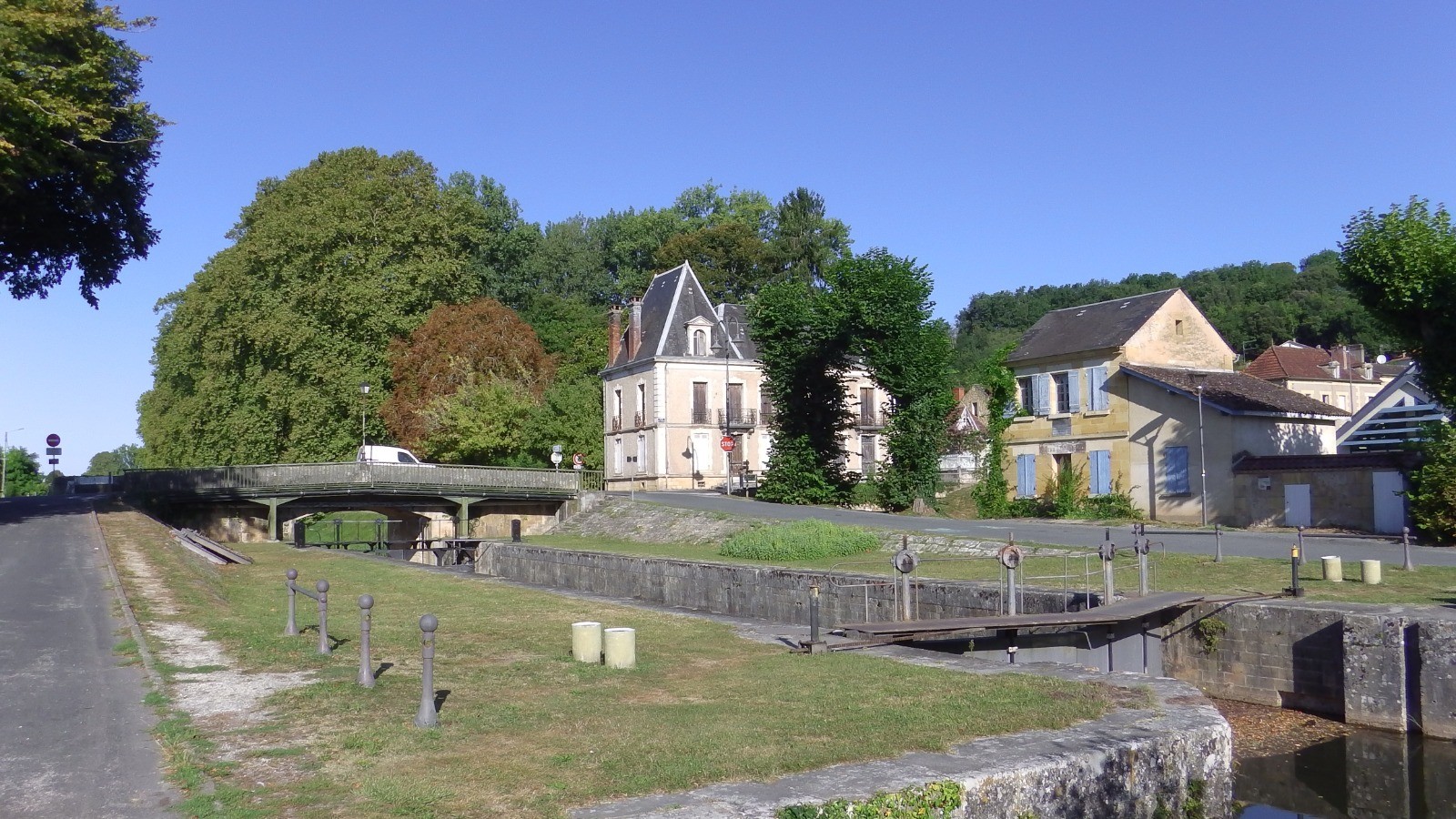 Départ: Lalinde, parking du port du canal au panneau de la rando, non loin de la spectaculaire mairie.Longer la mairie pour arriver à l'écluse, la franchir et partir à gauche devant la vieille maison éclusière et son panneau où les distances sont données en mètres ....
