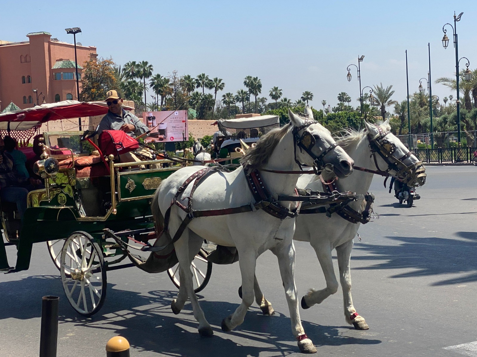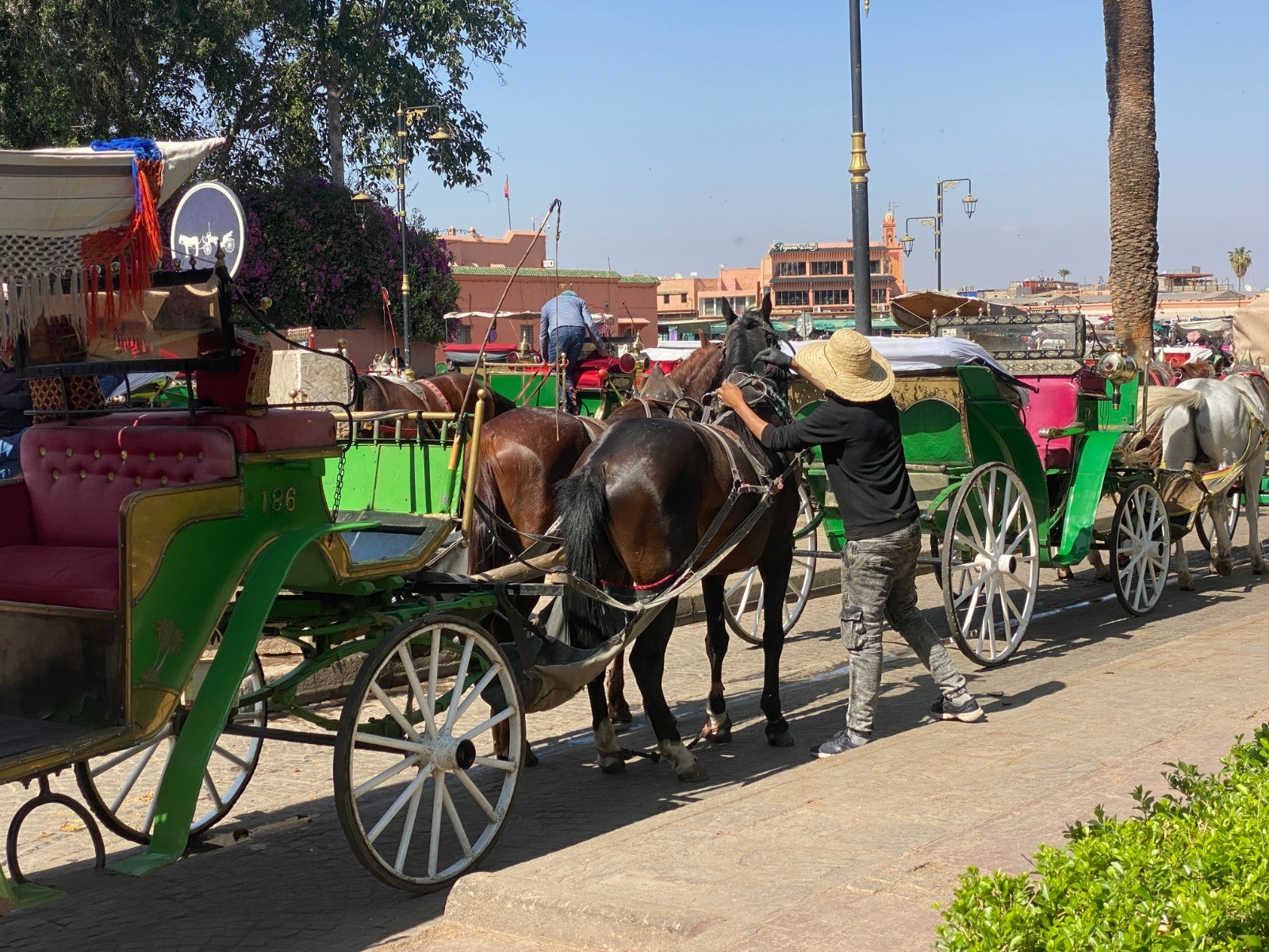 Stationnées dans l’avenue qui relie la place Jemaa el Fna à la mosquée de la Koutoubia, des dizaines de calèches attendent patiemment les touristes.