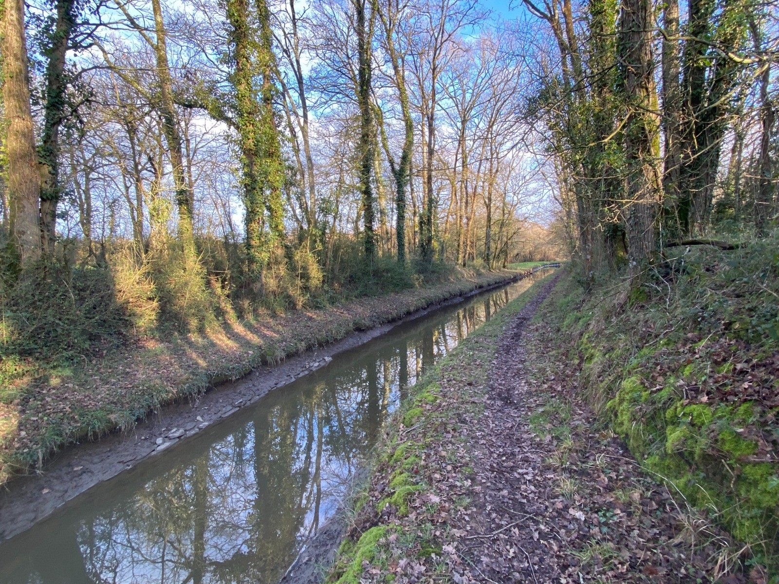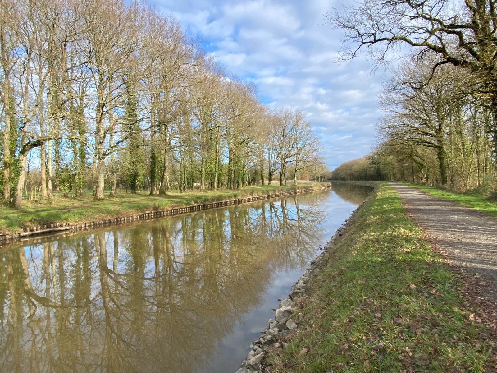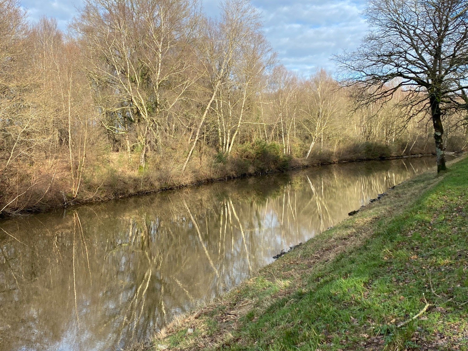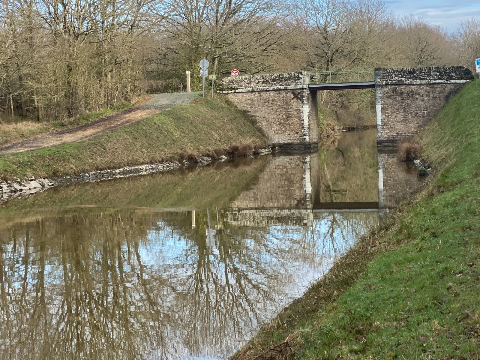 Rendu au bout de l’étang je vais emprunter le chemin de halage du canal de Nantes à Brest.
