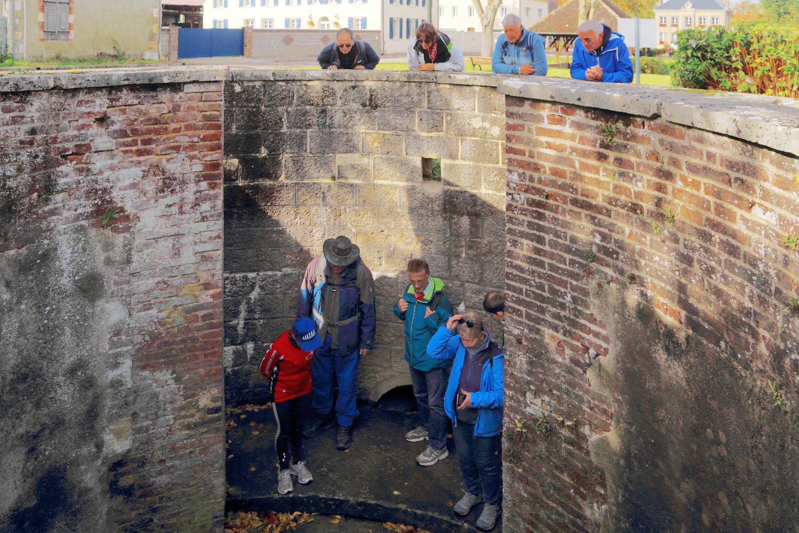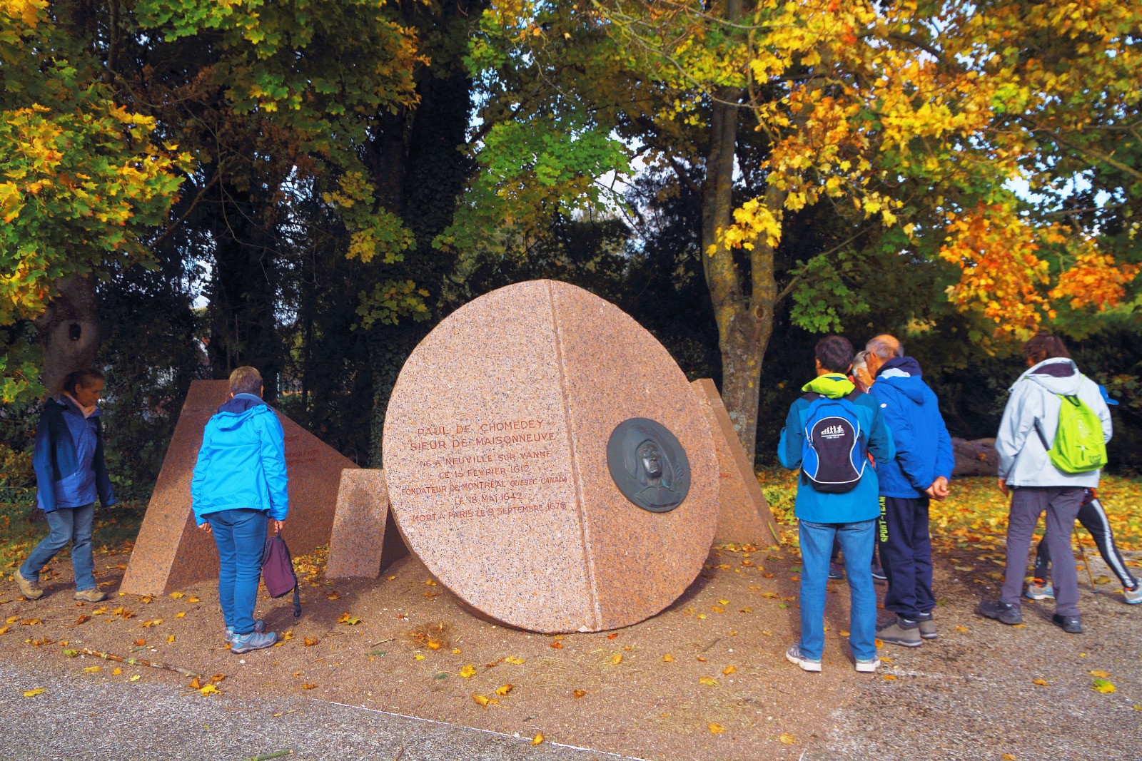 Passage du pont sur la Vanne après quelques rues tranquilles, ensuite commencent les chemins qui peuvent parfois être un peu inondés à la fin de l’hiver. Nouveau passage sur la Vanne par le moulin d’Aiguebaude en vue de Neuville, avant de prendre à droite le chemin du château dans le bois. En vue du clocher il faut prendre à gauche pour arriver au cœur du village, peu après le début du bitume on prend la pelouse vers les tables de pique-nique de l’aire de jeux, puis on continue à droite jusqu’au chevet de l’église où se trouve le mémorial Paul de Chomeday-de-Maisonneuve, né ici et fondateur de Montréal (d’abord « Ville-Marie ») en 1642. Tout près, l’église cache un mobilier classé ou inscrit aux Monuments Historiques, à l’extérieur un cadran solaire est gravé sur son mur sud (côté route). Traverser la grande rue pour accéder au lavoir qui, outre son intérêt patrimonial, peut servir d’abri. À proximité, voir la curieuse fontaine St-Martin au fond d’une sorte de puits, on y descend par un double escalier pour vérifier que l’eau, qui alimente le lavoir, est toujours tempérée même en hiver. On quitte la place par le chemin d’herbe barré d’une grosse pierre presque en face la rue Saint-Martin pour arriver au quartier neuf de Neuville aux rues « canadiennes », juste avant le croisement où se séparent les deux circuits.