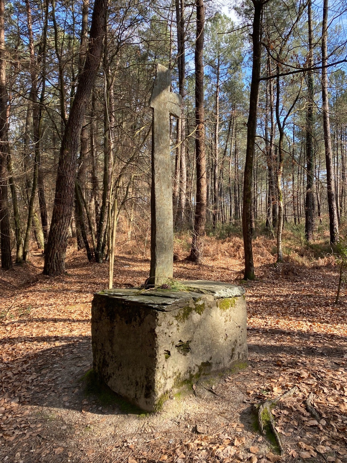 Croix en schiste ( photo no 8 ) qui aurait été érigée au début du XIXe à l’emplacement d’un chêne où des prêtres réfractaires célébraient la messe pendant la période révolutionnaire...