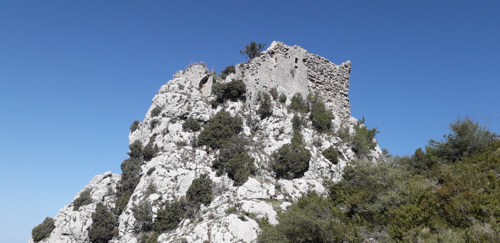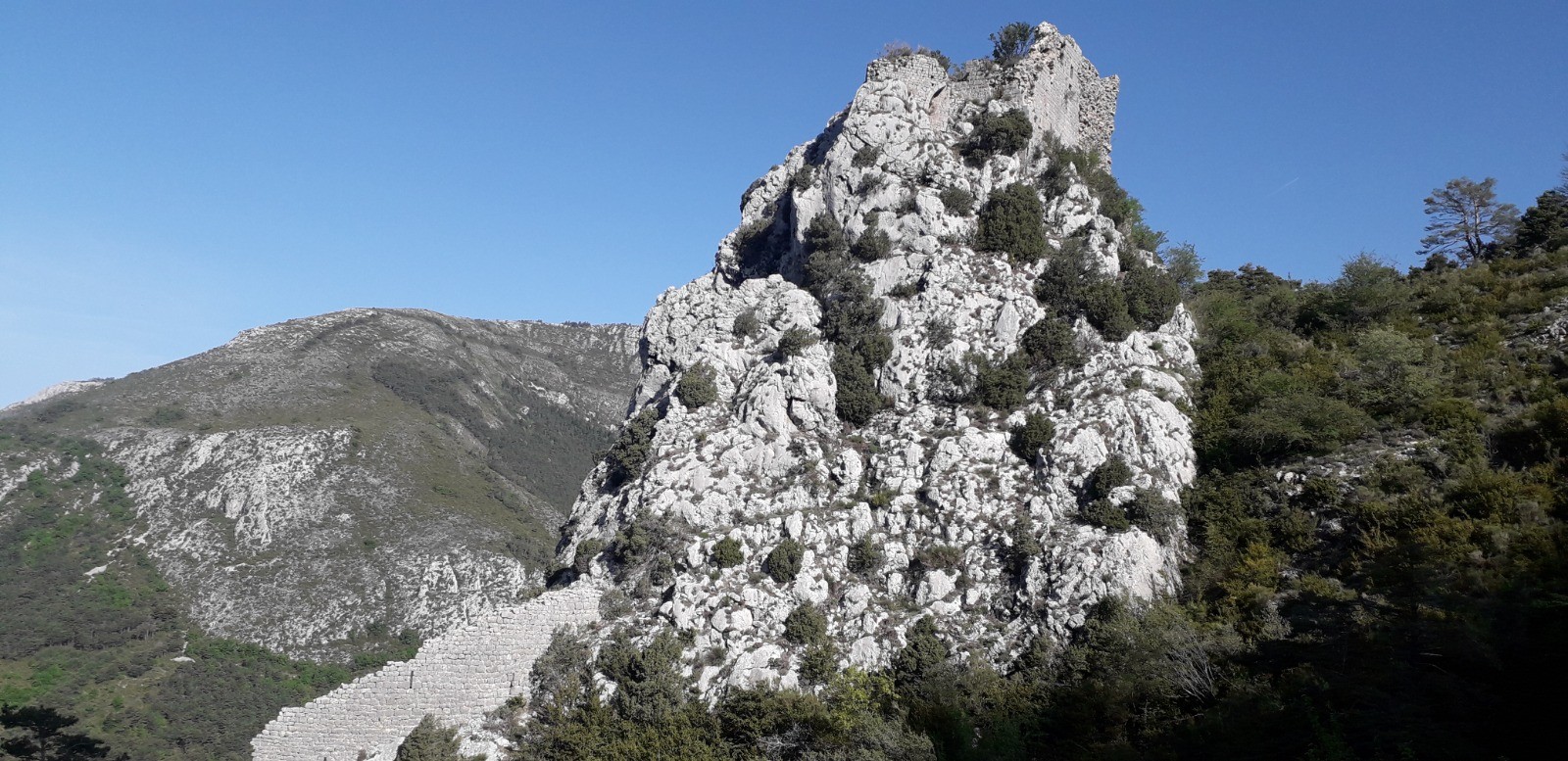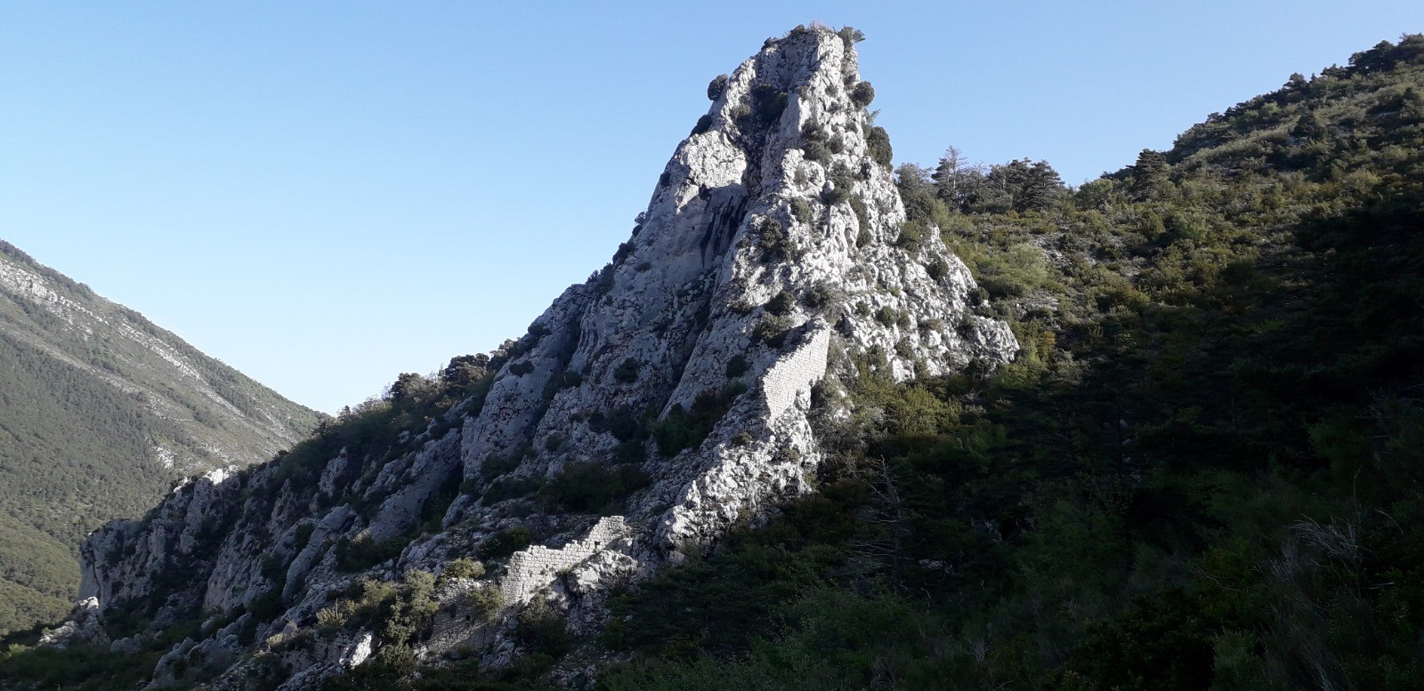 Phase en montée constante jusqu'à l'antécime du Lachens, avec un 1er point remarquable constitué par le rocher Sainte-Madeleine et son château féodal. Piton rocheux avec ruines presque inaccessibles de ce qui fut le "Castrum de-Bastida" dédié à Ste Madeleine et érigé au XI ème siècle. Ne subsiste que les murailles d'une tour sommitale avec une voie d'accès très difficile. Il faut contourner l'édifice par la gauche depuis le chemin de randonnée et escalader une partie rocheuse à l'aide d'une corde attachée à des souches d'arbres au sommet. Vous dissuade de faire de même car l'ascension est très exposée et dangereuse. La vue y est spectaculaire mais d'autres belvédères quasi-similaires sont situés sur le reste du parcours.