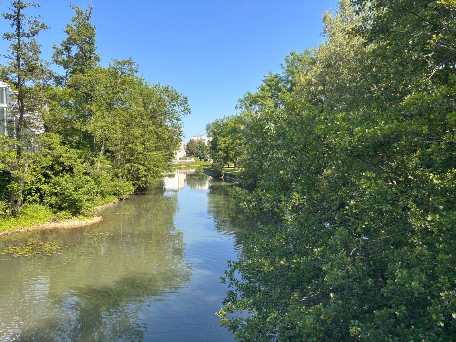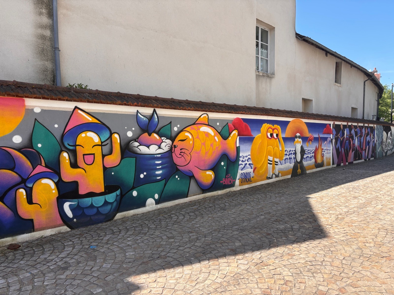 Ensemble de quatre fresques : Cité flottante, Farandole de jeunes, Petit baigneur, Poisson-chat. Sortir à gauche Rue Gambetta. Traverser La Rue du Général Leclerc puis, en face, le parvis de l'Église Sainte-Madeleine. (en face la spécialité de Montargis « les pralines »)Emprunter la Rue Triqueti à gauche, puis à droite la Rue Cour Jean Dupont. Enjamber le Canal de Briare par la passerelle. Traverser la Rue Renée de France et rejoindre le parking (D/A).