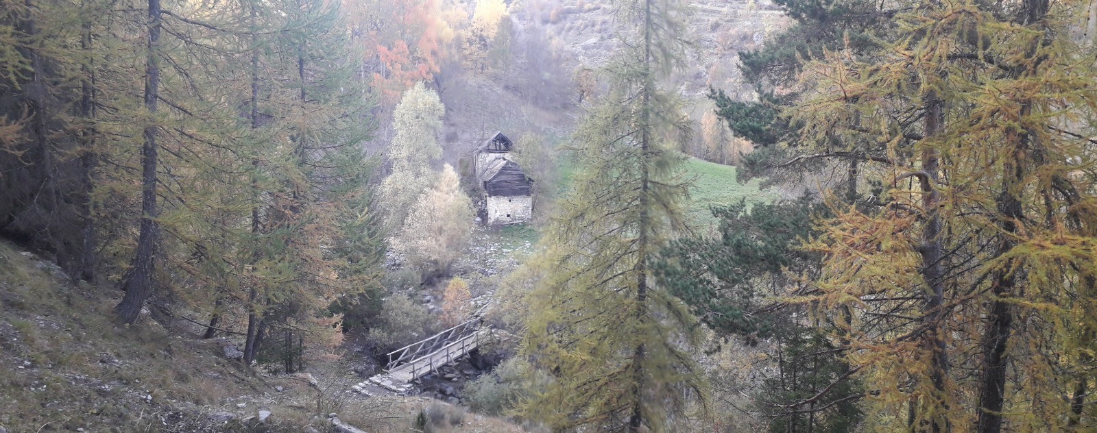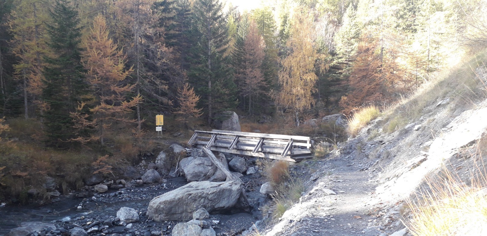Traversée d'un beau mélezin au km 14,70 après franchissement du Vallon de Sallevieille avec cheminement continu en milieu boisé jusqu'au hameau de Roya.