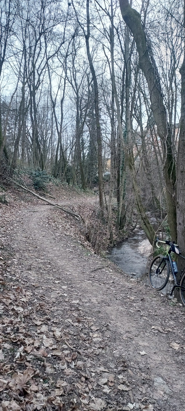 Sorti de la ville on continue par le sentier des trois noyers qui commence par une piste large coincée entre un champs et un bois puis se termine par une petite montée courte mais raide qui passe sur le vélo. S'en suit encore un peu de route en ville pour arriver au bois de Serre ou de très jolis chemins et une belle vue sur des ouvrages ferroviaires nous attendent. A la fin du bois on sent déjà qu'on est quasi arrivé à Lyon et que c'est fini pour la verdure mais des petits chemins notamment le long du ruisseau des planches, ou l'on accède par une descente courte mais très pentue nous permettent une acclimatation en douceur.
