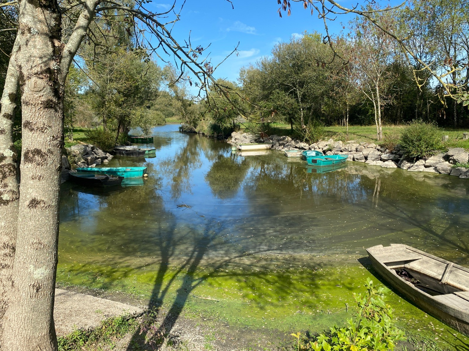 Rapidement, nous voilà engagés dans une étroite allée forestière( photos no 1 & 2 ), et, au deuxième kilomètre, je quitte le tracé principal pour me diriger vers le port des Roches, un charmant petit havre où règne une quiétude apaisante. ( photos no 3 & 4 )