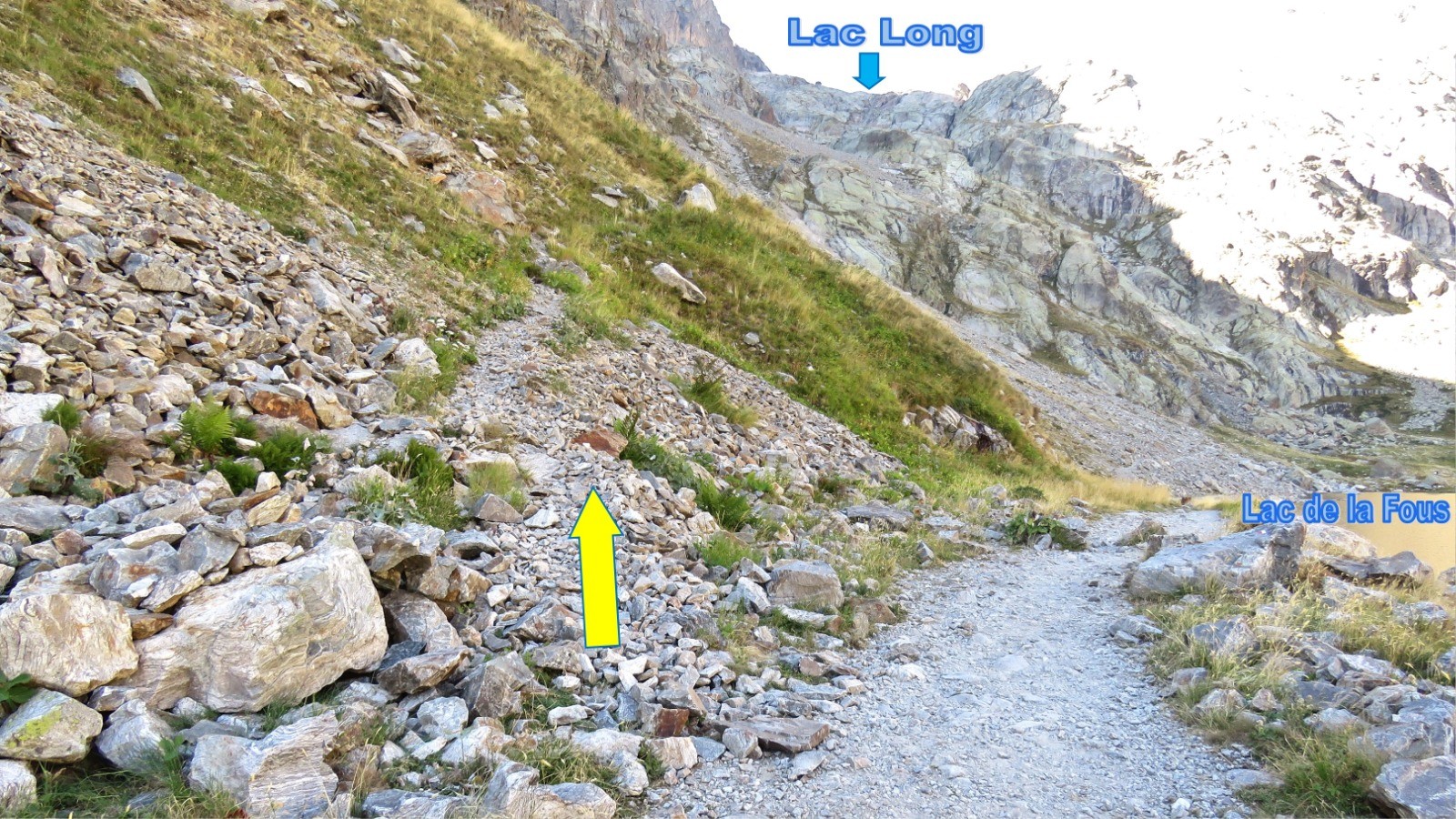 Une centaine de mètres après le barrage, prendre le sentier qui monte à gauche vers le Lac Long (voir photo).