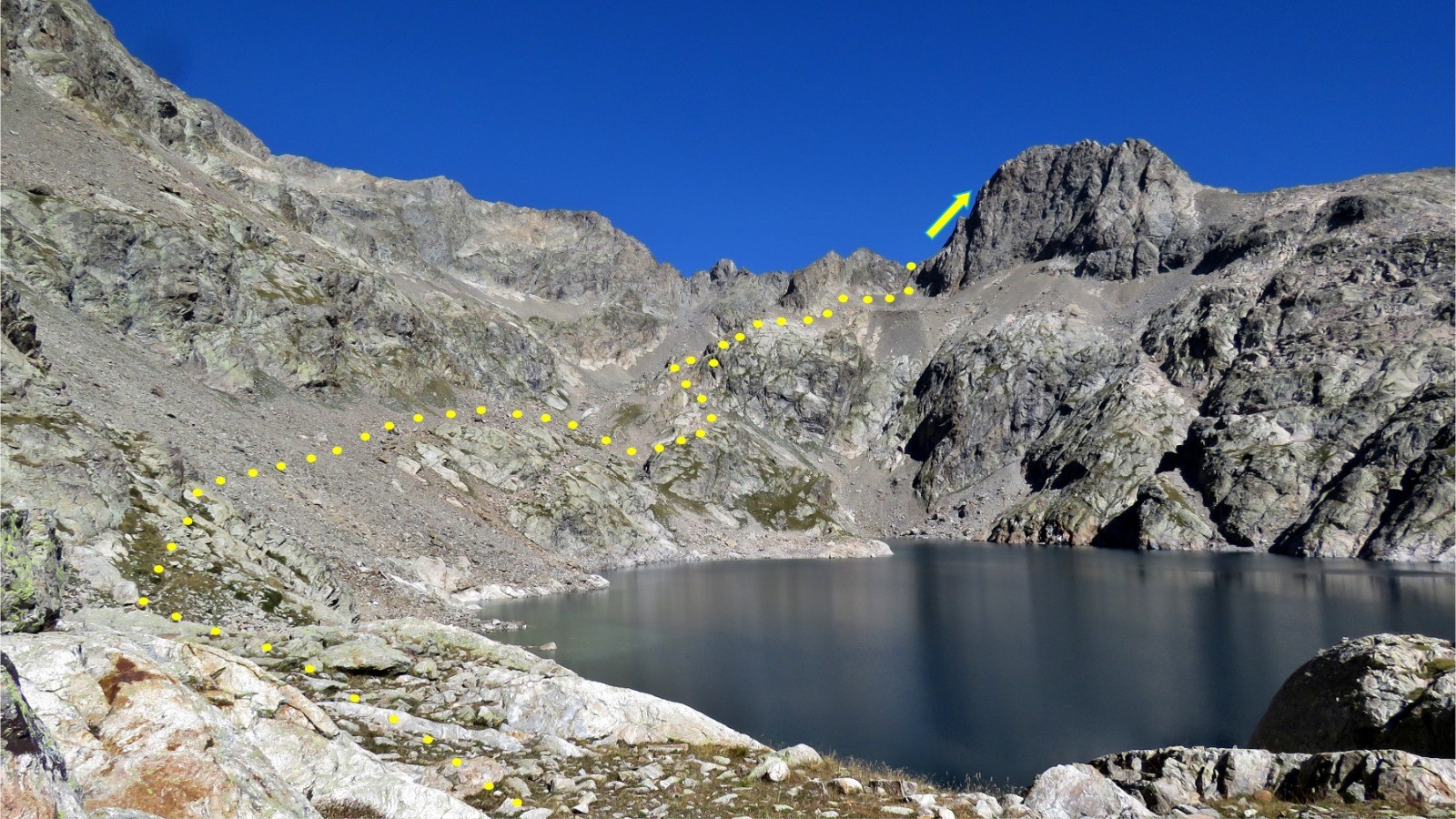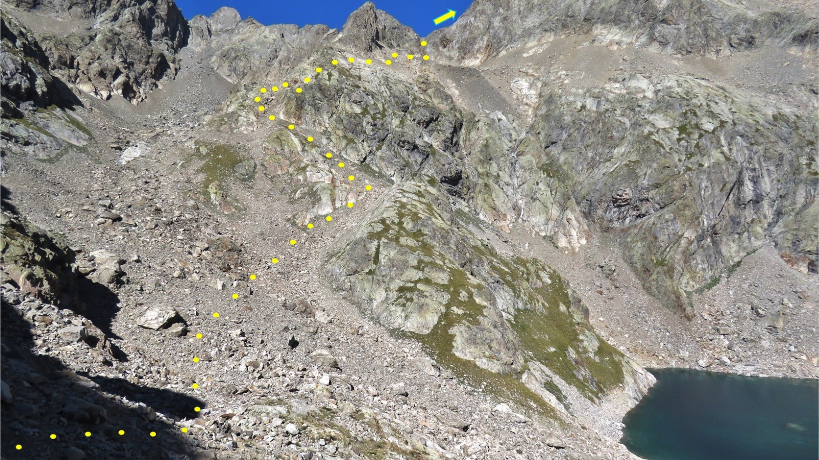 On aperçoit un peu sur la gauche le petit sentier qu'on va suivre un bon moment dans un gigantesque éboulis comme le Mercantour sait en faire. Il faut descendre un peu dans la direction du sentier (voir photo).