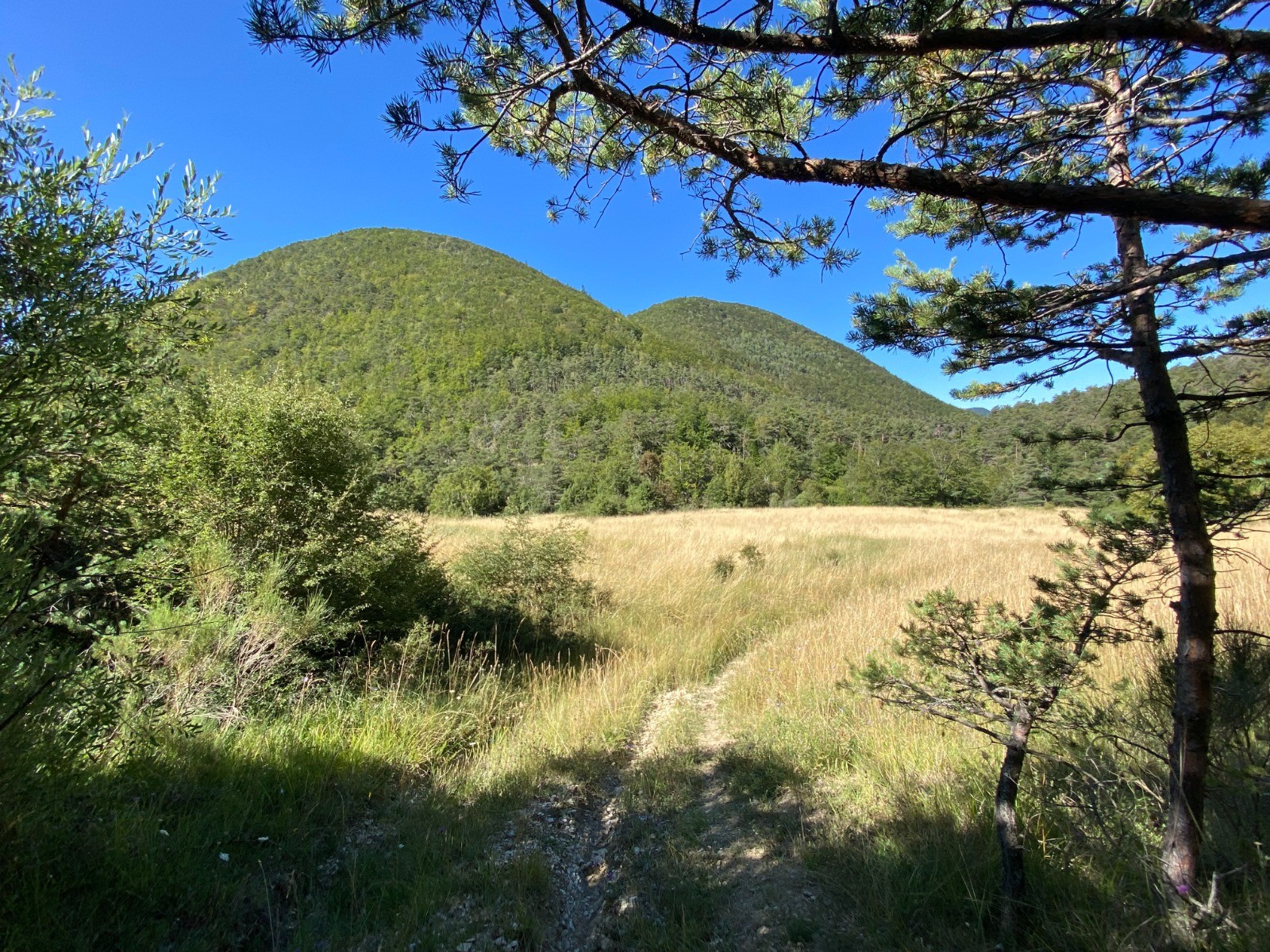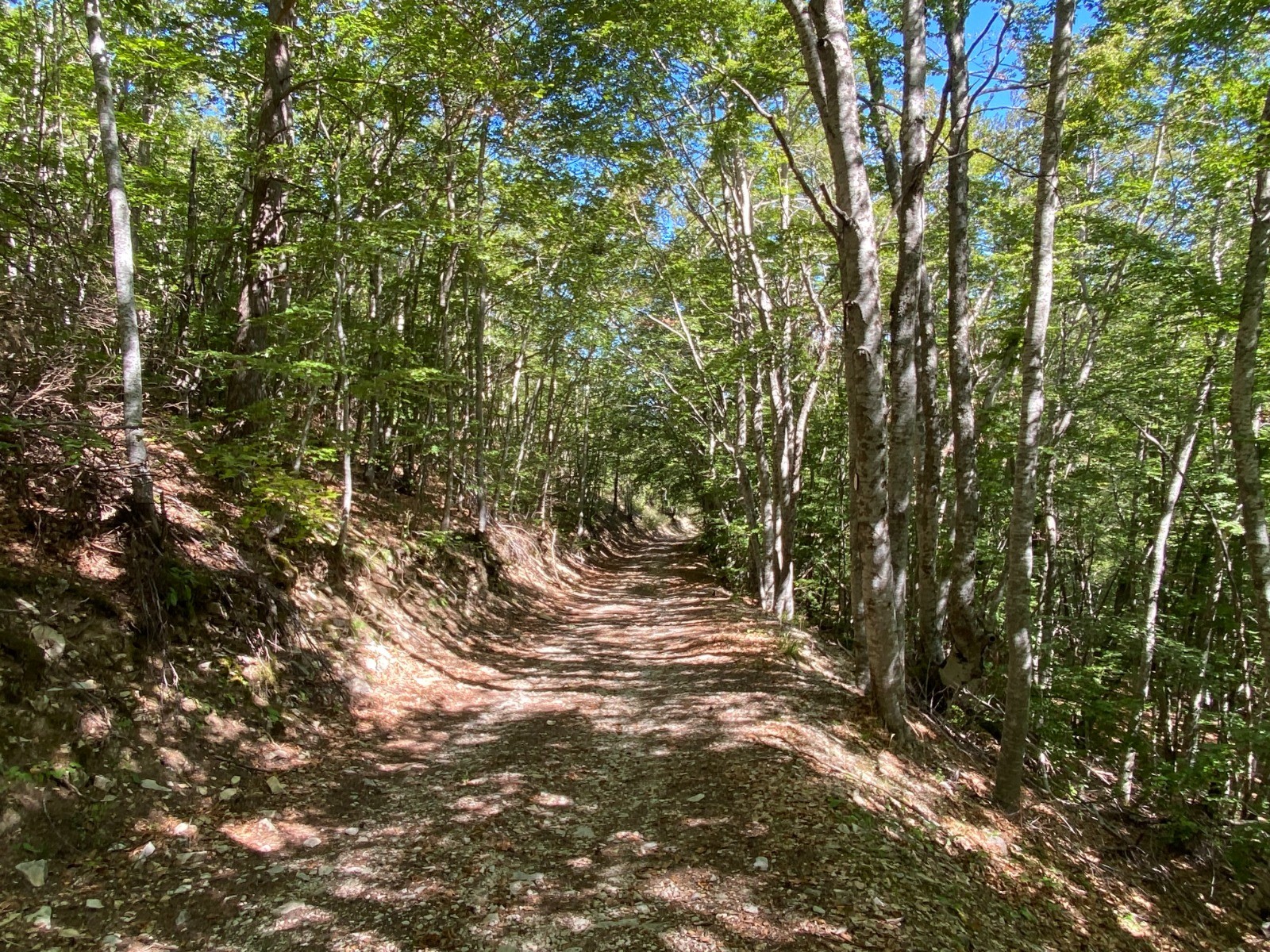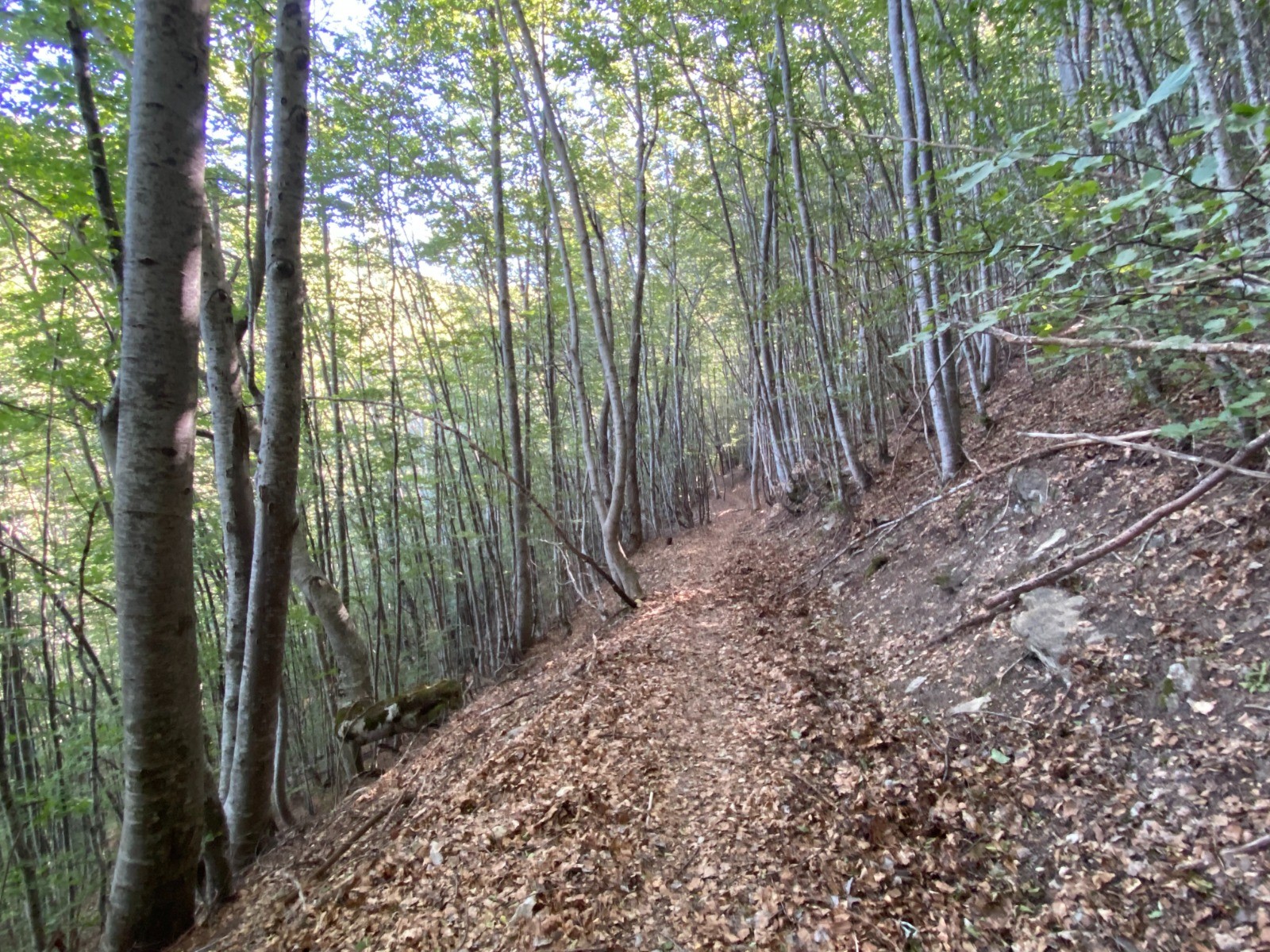 Va suivre un long chemin forestier où les hêtres remplacent les pins.