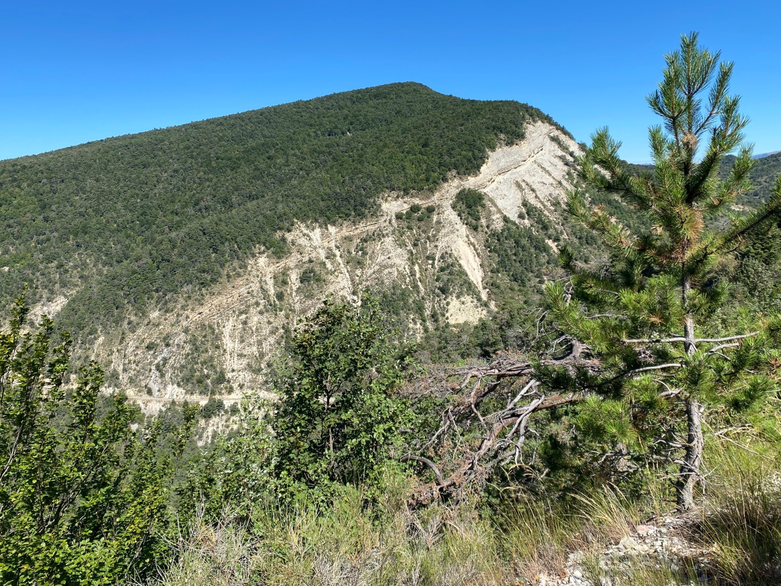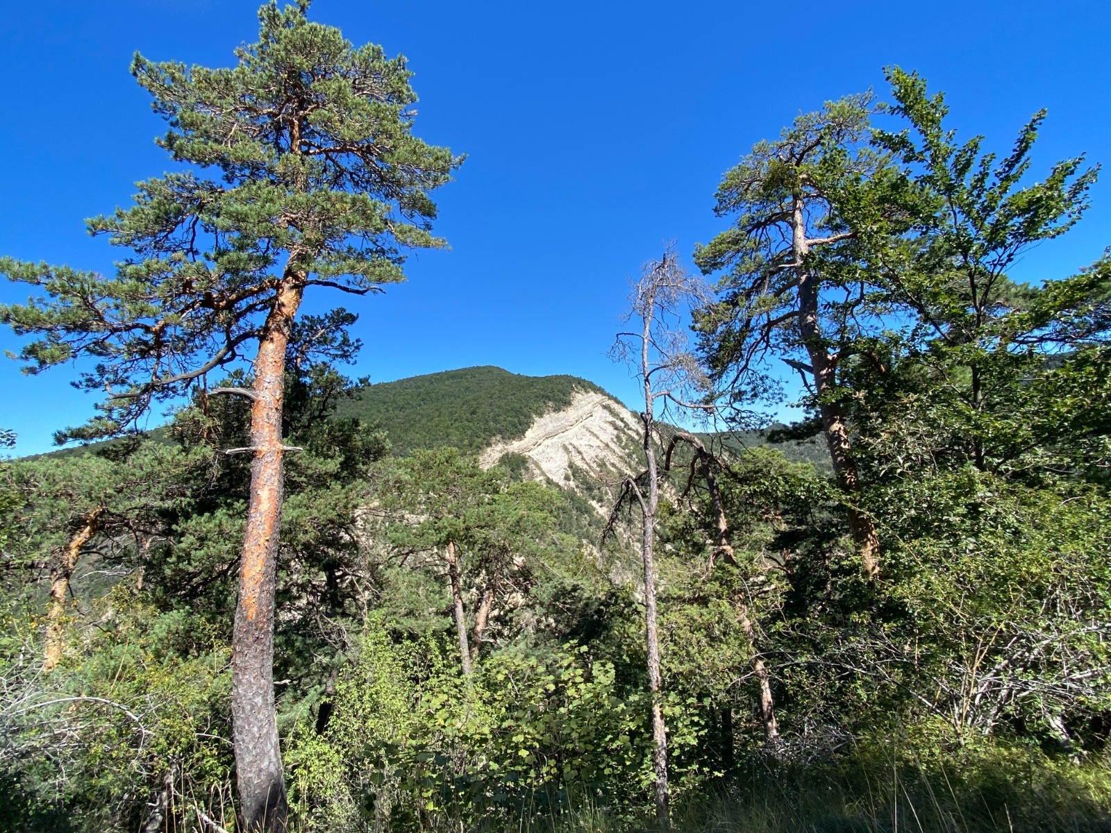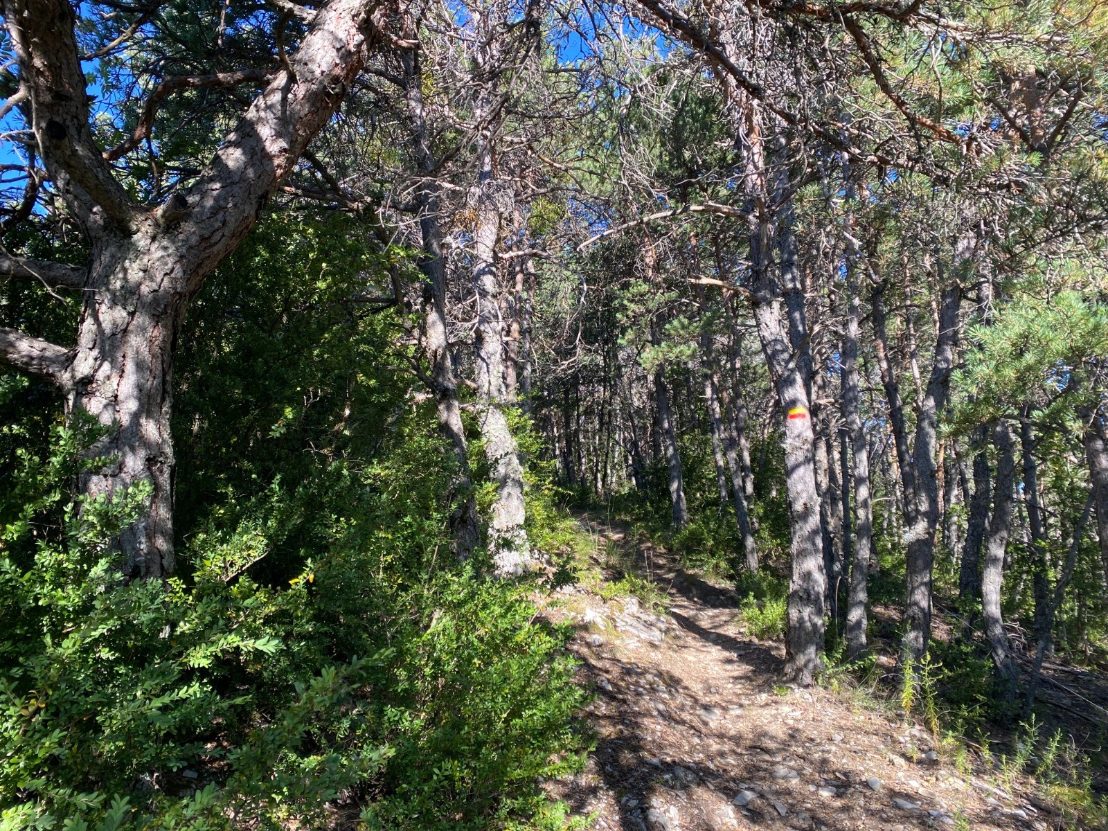 Après quelques mètres de macadam où le sommet du col est annoncé à 5 kilomètres, nous prenons un chemin très ombragé parmi les pins ( pins noirs d’Autriche ).