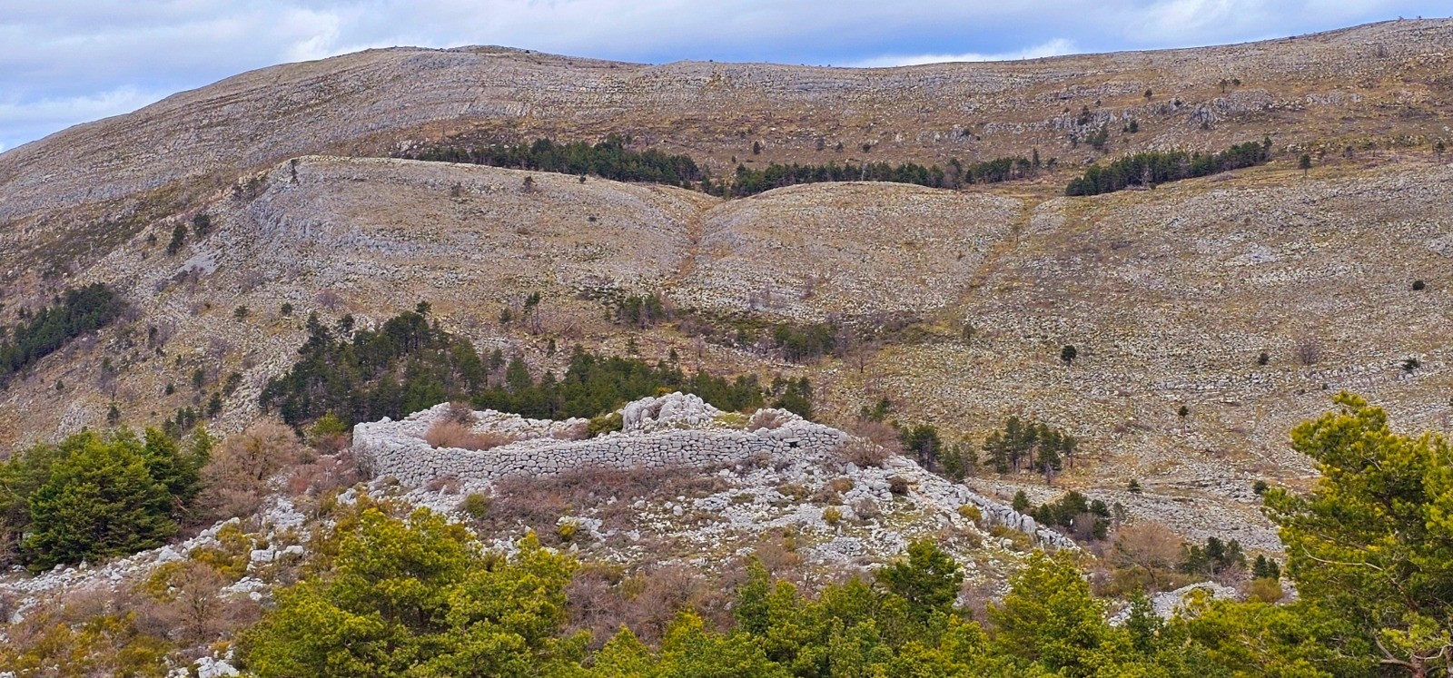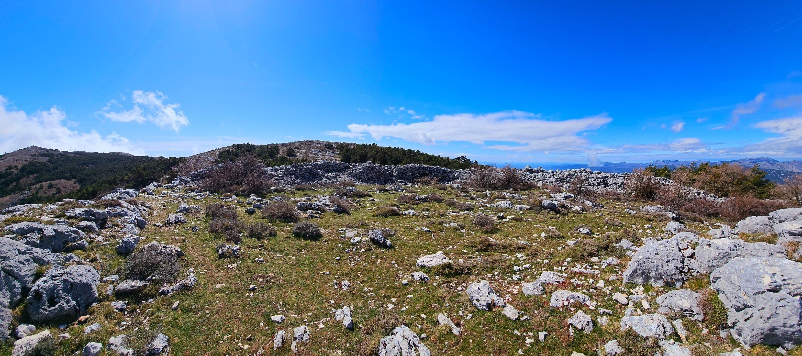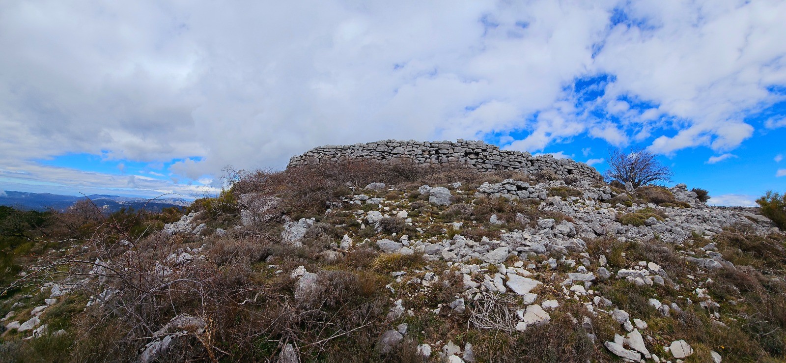 Emprunter le chemin débutant à hauteur du pylône du col et se diriger vers l'est en délaissant la 1ère bifurcation à droite (chemin de retour). Intersection en patte-d'oie 110 m plus loin. Prendre la sente située à votre gauche qui va sinuer sur ligne de crête jusqu'à la balise 64 en passant par les points côtés 998 et 1027. Beau panorama avec sentier que j'ai parcouru par une brume matinale très dense dans une ambiance magique et spectaculaire. Depuis bifurcation balise 64, poursuivre toujours plein est en suivant les points hauts qui jalonnent ce cheminement en crête jusqu'au point côté 1092 (Le Mortier) à partir duquel on amorce une agréable descente jusqu'au col du Ferrier (balise 61). 1ère portion de cet itinéraire par belle sente "cairnée" avec alternance marquage jaune, exigeant sens aigu de l'orientation. Phase ascensionnelle modérée du col du Ferrier au Castellaras de la Malle (2,55 km pour d+ 174 m) par sentier bien marqué longeant plusieurs bories et vestige d'abri ligure. Traversée d'un bois de pins sylvestres avant de découvrir le Castellaras et ses caractéristiques remarquables : enceinte en arc de cercle sur à-pic avec mur de soutènement sur rempart de 4 m de large pour 5 m hauteur maximale, pour surface de 108 m de long et 31 m de large avec 2 portes d'accès au nord et au sud contre l'à-pic.